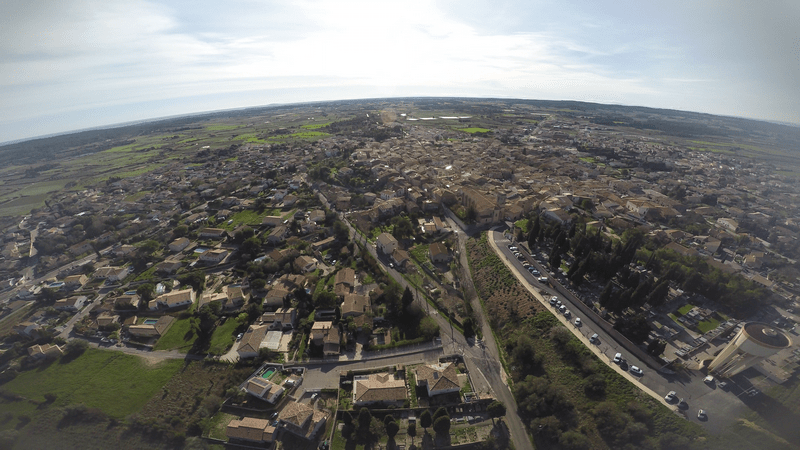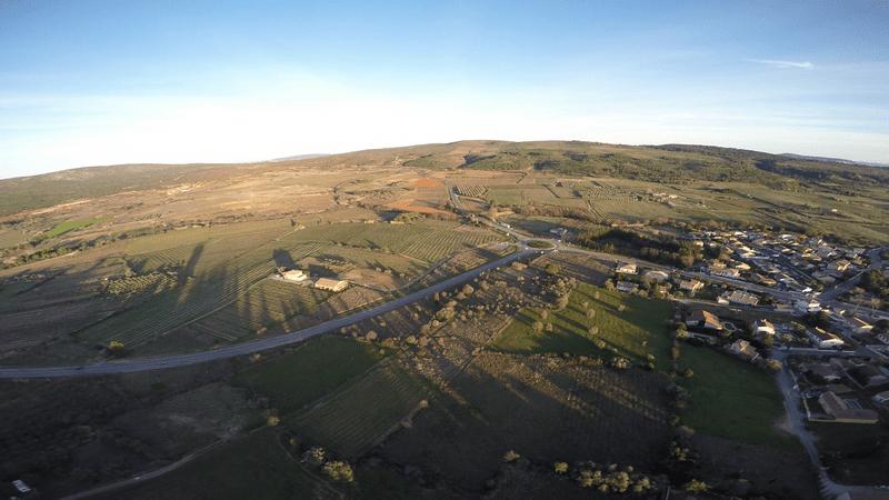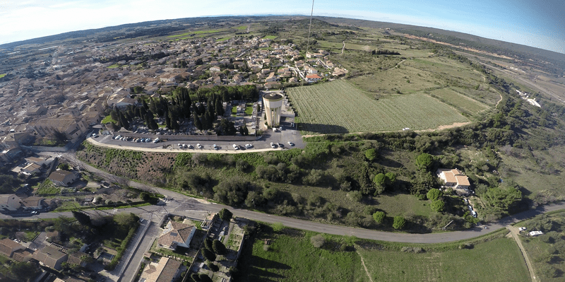 Villeveyrac est une petite ville de l’Hérault coincée dans les collines entre Montbazin et Sète. Ici, ni château, ni fouilles archéologiques, si curiosités classées au patrimoine mondial de l’UNESCO, seulement le village de l’un des membres du club OK Mistral, grand amateur de photos aériennes et d’archéologie. Un vent soutenu de nord-est (25 à 40 km/h), une belle lumière de printemps, il n’en fallait pas plus pour aller planter nos caméras à 100m du sol.