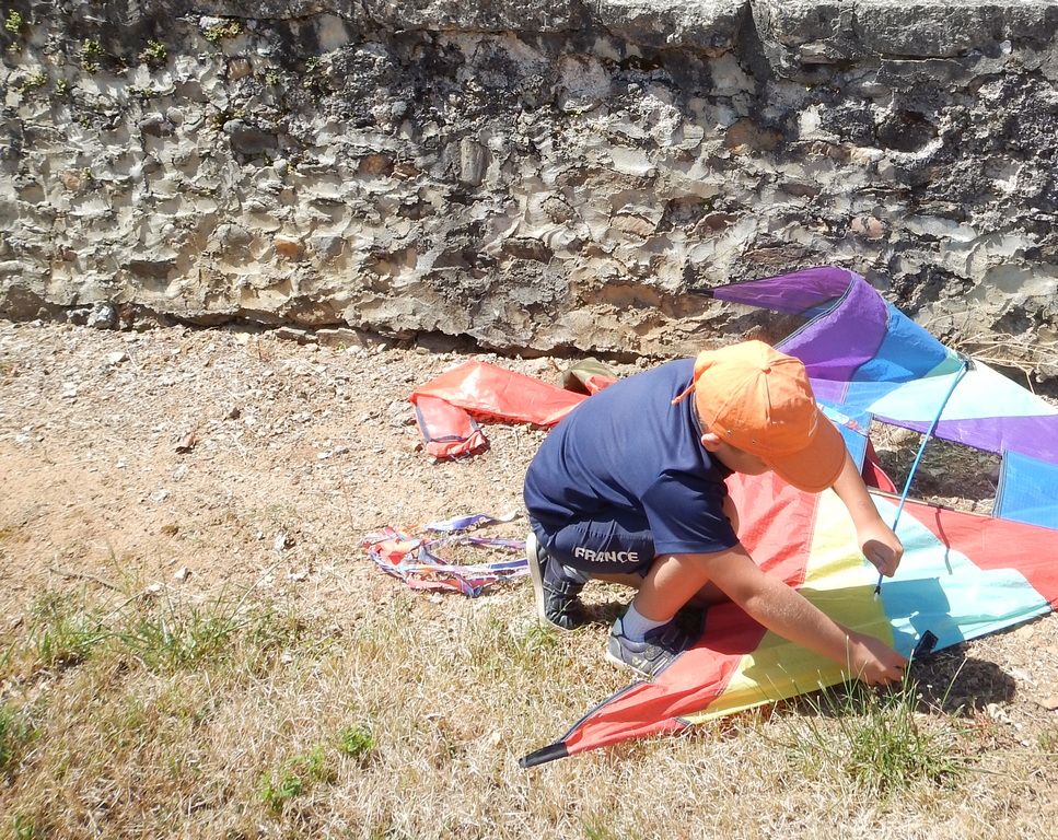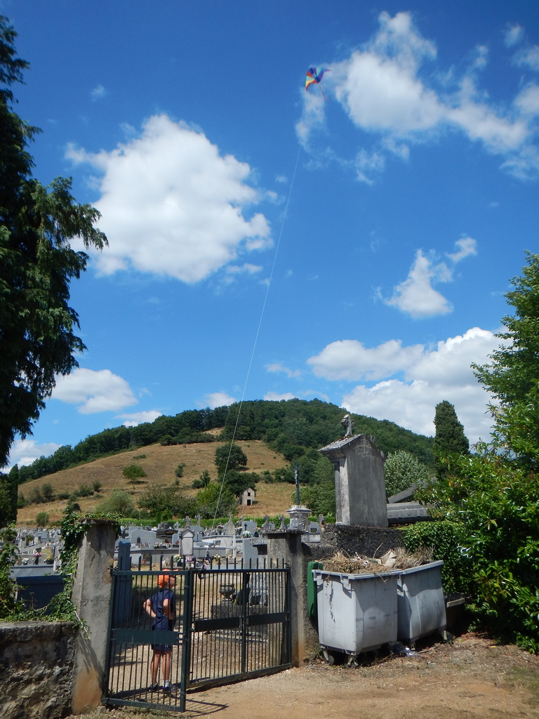 Sur la minuscule terrasse du monument qui surplombe la ville de St Géniez d’Olt, à 30m au dessus des toits, les touristes regardent du coin de l’œil un gamin de 9 ans en train de monter son cerf-volant.