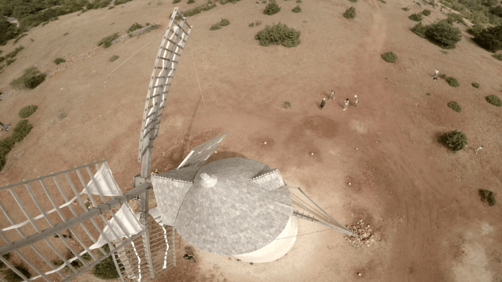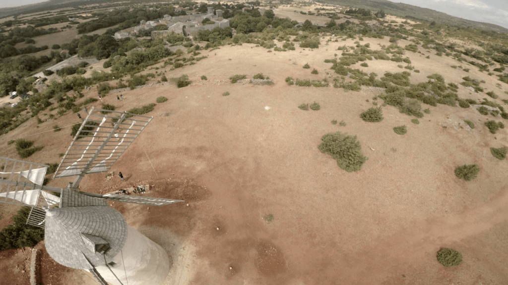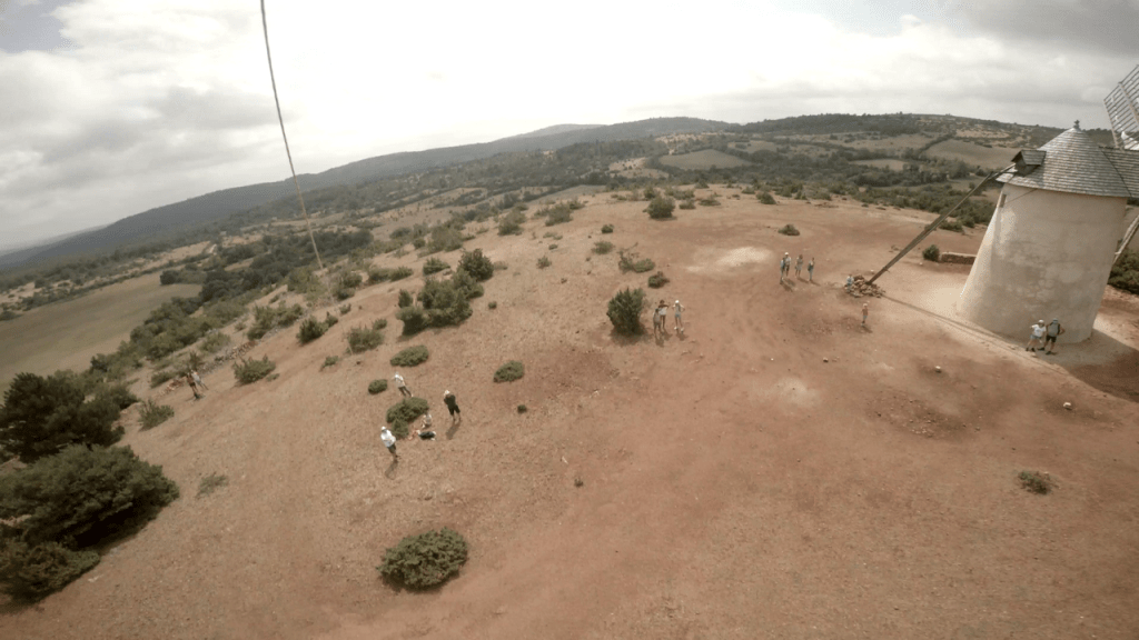 Aujourd’hui c’est un vent de cinéma qui aura finalement étonné les visiteurs de l’endroit par la facilité et la rapidité de mise en œuvre du cerf-volant et de sa nacelle vidéo automatique. Pas moins de 10 personnes intriguées sont venues au contact , dont un moniteur fédéral de la FFVL, (accouru depuis la cité fortifiée), pour ne pas manquer le zigoto en train de voler au dessus du moulin et bien visible au dessus des tours fortifiées. Pas moyen de rester incognito quand on pratique le KAP, mais c’est tout aussi bien, car le cerf-volant est une autre approche que le drone, autrement plus conviviale et moins invasive, surtout quand on remet une carte de visite avec les liens pour que chacun puisse découvrir le reportage et les photos du jour.