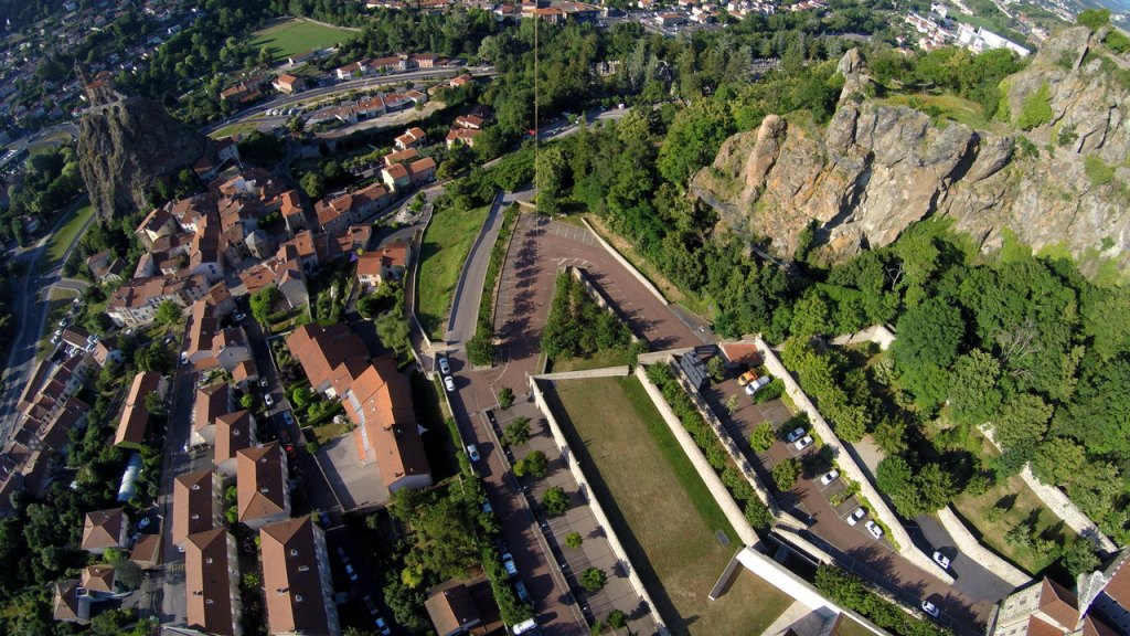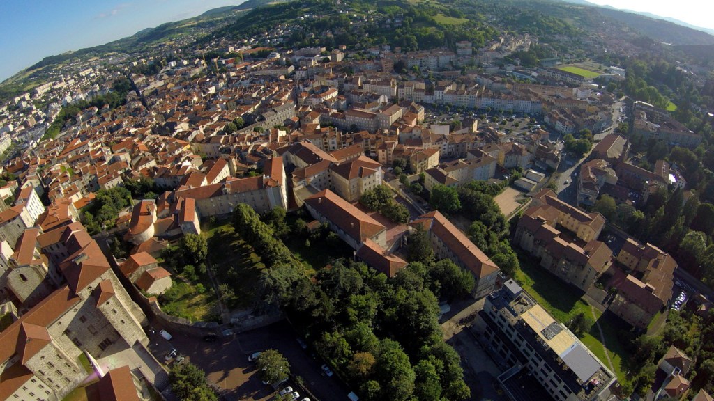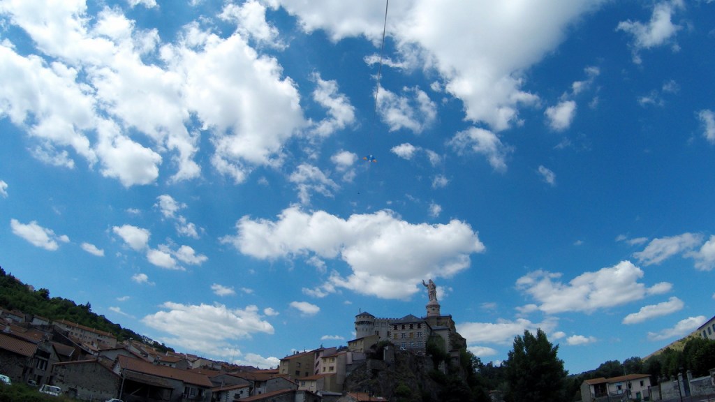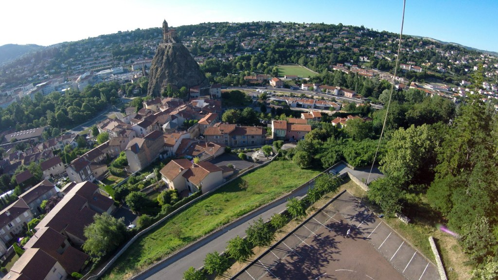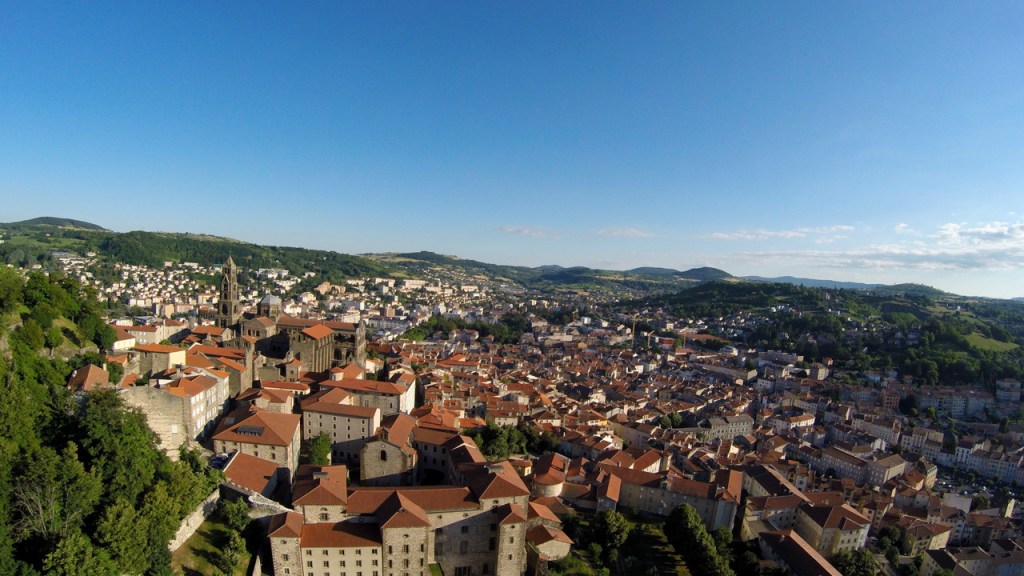 Pour réaliser cette photo, j’ai du arpenter la ville en long et en large pendant une journée (prés de 25km à pied et à vélo). Le challenge était de taille : déterminer un espace dégagé permettant un envol et un survol sans risques, évaluer les vents en fonction des heures et de la position du soleil (lumière), définir le meilleur angle de vol pour photographier le plus de monuments possibles (et ils sont nombreux au Puy en Velay).