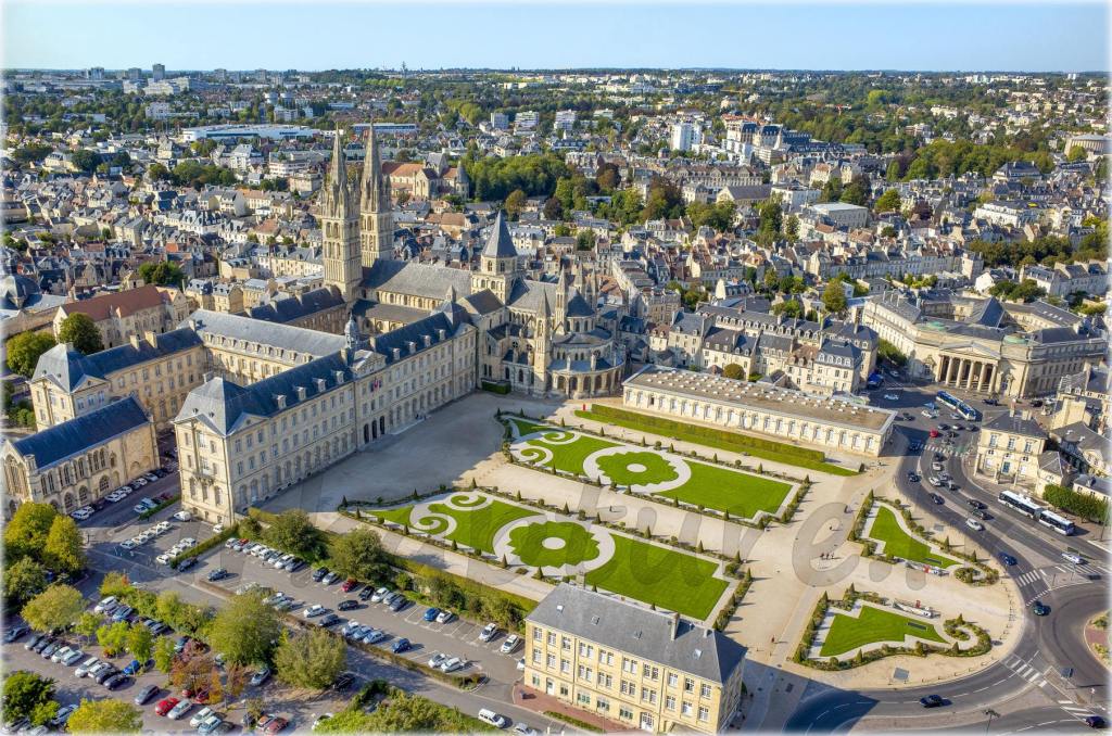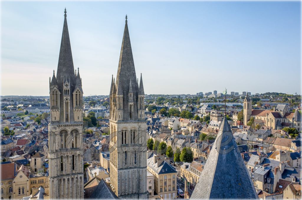 « Tempête de ciel bleu au dessus de la Mairie et l’Abbaye aux Hommes de la Ville de Caen depuis mon cerf-volant. L’abbaye aux Hommes, ou abbaye Saint-Étienne de Caen, est une des deux grandes abbayes, avec l’abbaye aux Dames, fondées par Guillaume le Conquérant à Caen, en France. Elle s’élève à l’ouest du centre-ville ancien et donna le nom de Bourg-l’Abbé au quartier qui l’entoure.