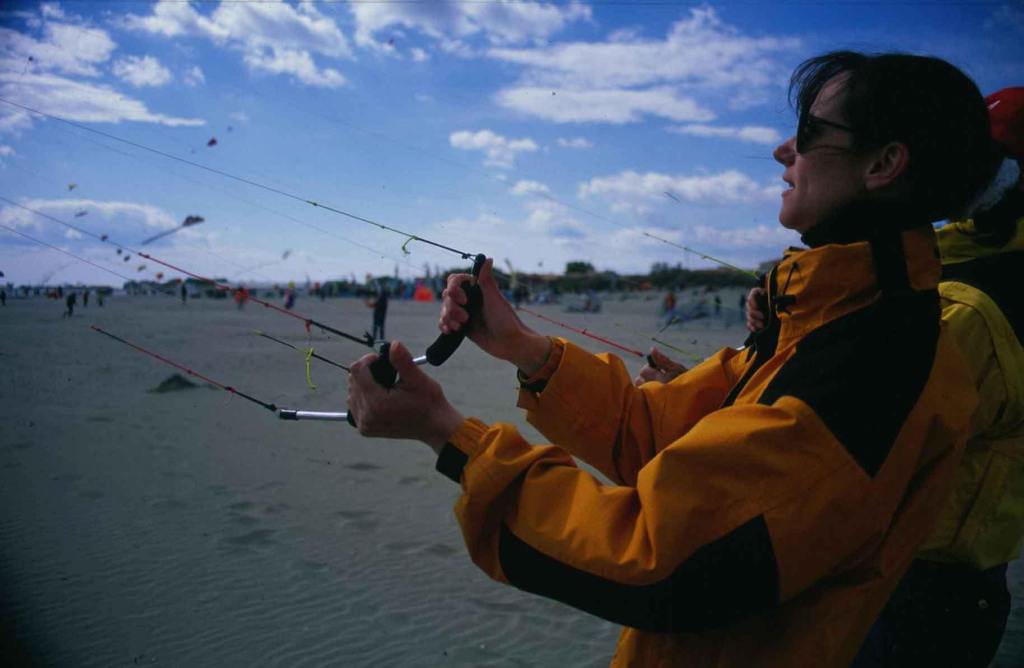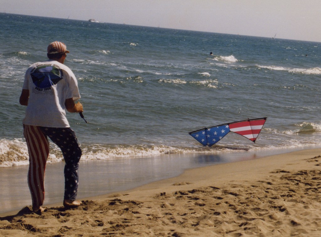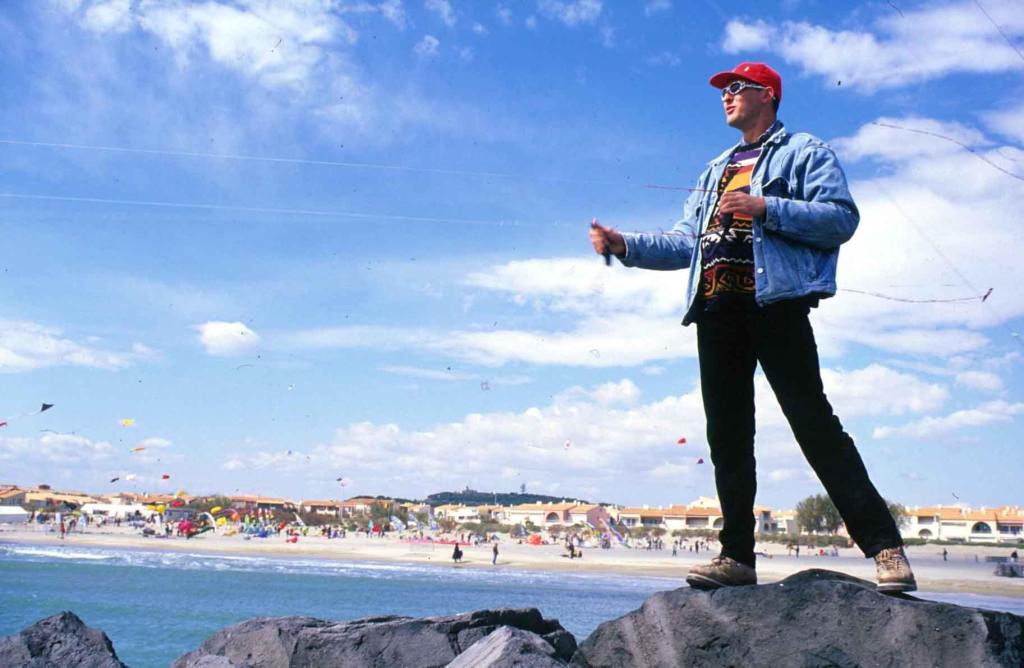 « Ralala…. 25 ans dans la tronche en 1 seule photo, la moitié de ma p’tite vie !!! Et au delà de cette photo et de l’article associé, c’est 25 ans remplis UNIQUEMENT de bons moments…Je m’en souviens comme si c’était hier. Fraichement arrivé à Toulouse 2 mois auparavant, fort de 12 ans de pratique cerf-volistique dans mon Auvergne natale, j’ai entendu causer d’un festival au cap d’Agde. J’y vais, j’arrive le samedi en fin de matinée au milieu d’une sorte de kermesse tout à fait attirante. Je sors mon Révo, un REV II, et je vole. Et vu que quand je vole mon horloge biologique cesse d’avancer, je continue de voler, voler, voler encore… Et d’un coup, alors qu’il fait nuit noire et que je vole encore, j’entends une voix qui vante mes exploits, qui déclare que je suis américain, etc etc…C’était Michel dans une de ses célèbres odes oratoires…. Dès la fin du vol de nuit, il est venu me voir pour m’ouvrir les portes du monde des festivals de cerfs-volants et des copains qui le remplissent…Et ensuite, il y a eu FLIC…C’est par ce biais là que j’ai trouvé ma voie et rencontré et aimé tellement de gens vraiment particuliers.