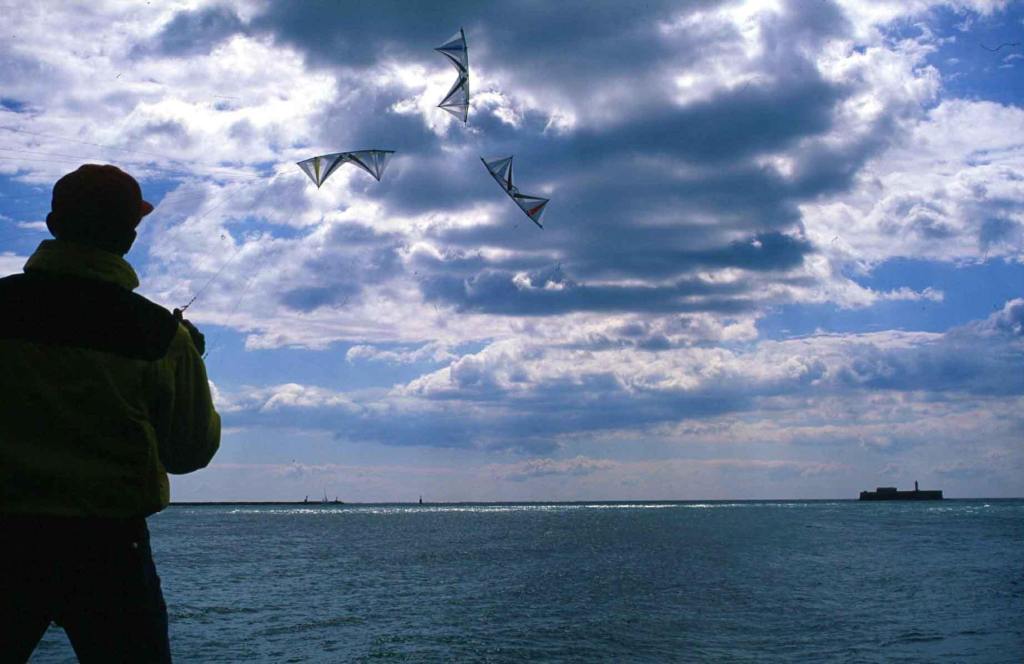 Face au fort de Brescou, un pilote de cerf-volant acrobatique à 4 lignes profite d’une accalmie de la Tramontane pour offrir un ballet de cerfs-volant à la mer.