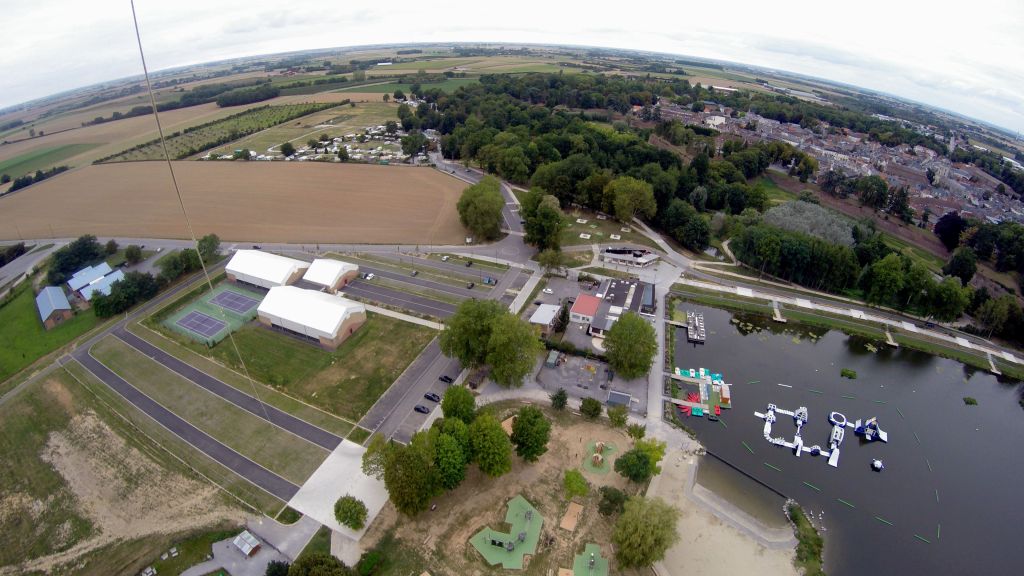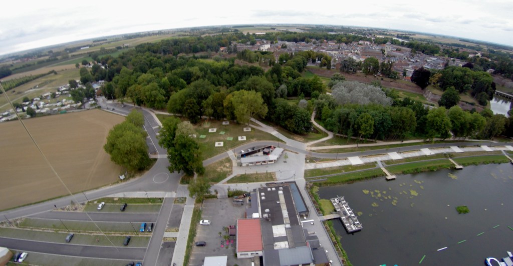 C’est sur les berges de l’étang du Pont Rouge, prés du tennis club du Quesnoy que j’ai pu trouver l’endroit idéal pour décoller. Pas de curieux pour cette séance, en septembre et en semaine l’endroit est plutôt désert. De la-haut, j’ai découvert tous les aménagements réalisés sur le plan d’eau que Vauban avait imaginé, en son temps, comme une arme redoutable destinée à inonder les basses fosses de ses fortifications, une fois envahies par les assaillants. Le stratagème n’aura jamais été utilisé.