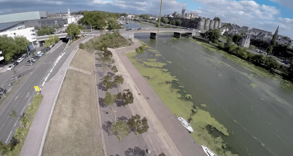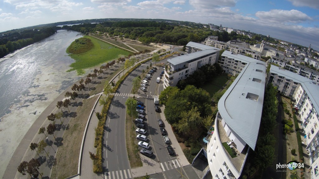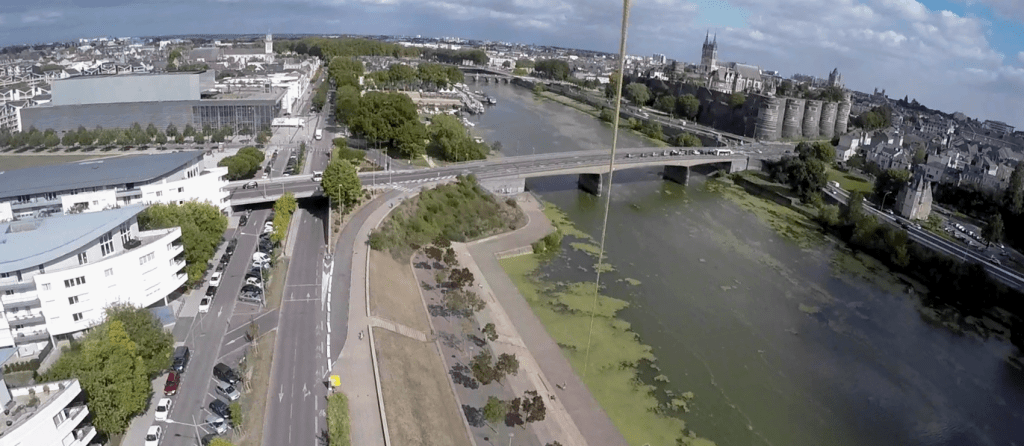Les arbres, les pieds dans l’eau, avaient bien poussé depuis, ils en avaient eu le temps. Déjà à l’époque on prétendait qu’ici l’aérologie était capricieuse, aujourd’hui elle s’est révélée particulièrement complexe au milieu d’une forêt ou encerclé d’immeubles. C’est donc du côté du pont sur la Maine, à moins de 100m du cœur historique d’Angers, que j’ai déroulé ma ligne de 120m pour shooter la perspective de la rivière sur fond du château d’Angers et des flèches de la cathédrale St Maurice. Personne, même pas un curieux, ni un « bleu » pour me contredire dans mon choix de voler ici.