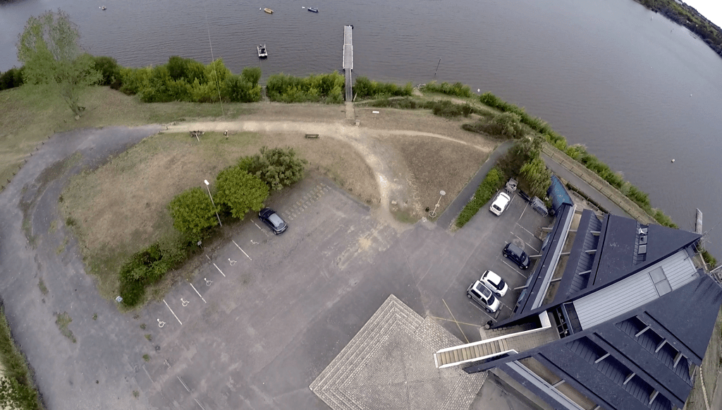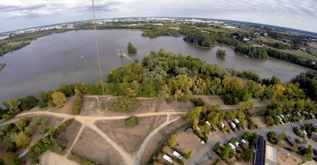 Pas moins de 6km pour faire le tour du lac et repérer les sites à survoler : la prairie de l’ancien festival, la base nautique et le camping urbain. Seul un promeneur en fauteuil, prés de la plage du lac de Maine, se sera finalement arrêté pour m’interpeler sur cette curieuse façon de prendre des photos :