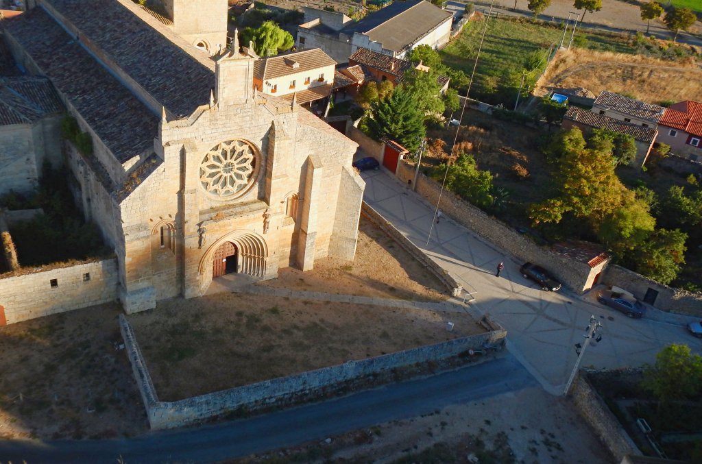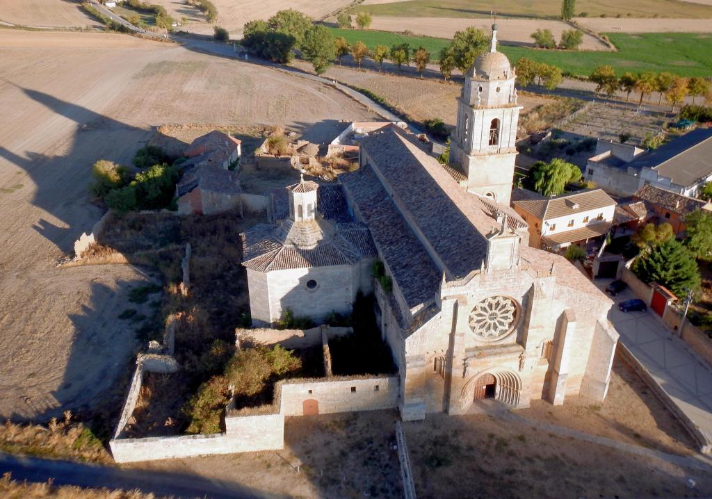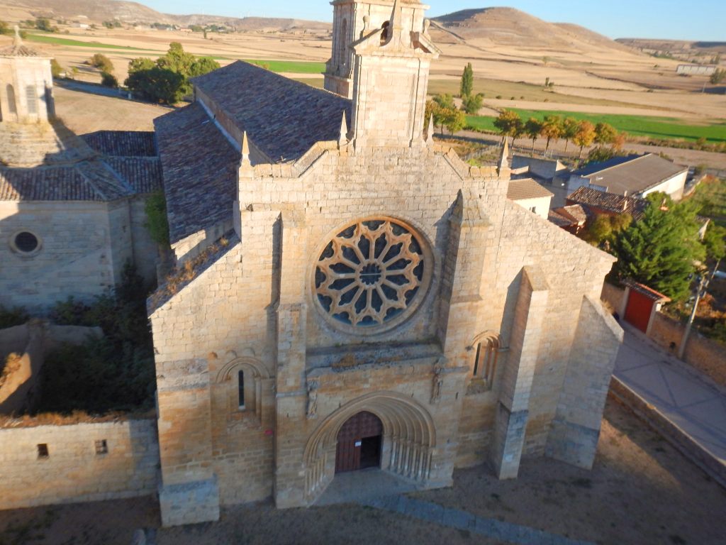 Le temps de quelques photos et de redescendre les pentes escarpées, le soleil s’approchait déjà de l’horizon. Impossible de quitter cet endroit sans photographier, en prenant un peu de hauteur, la Collegiate de Santa María del Manzano. Au carrefour du camino Frances et du camino Las Eras Bajas, plusieurs villageois et le sacristain de l’église m’attendaient de pied ferme. Finalement cette apparition volante, une première de mémoire de Castillans en ces lieux, les avaient intrigués.