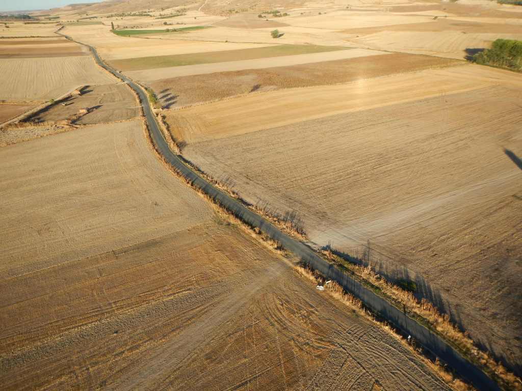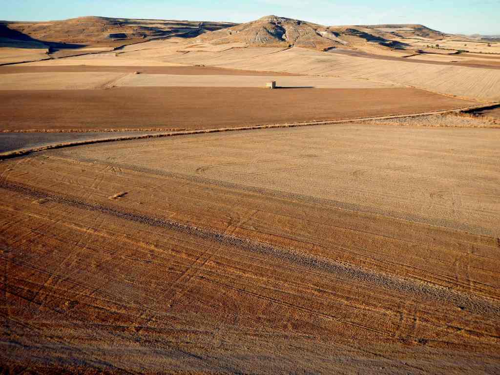 De là-haut la vue est incroyable avec cette sensation d’être dans la vigie d’un vaisseau amiral, au milieu d’un océan de terres brûlées par le soleil. C’est la fin de l’été et depuis longtemps, il n’y a ici plus une goutte d’eau. La culture céréalière intensive achève d’épuiser cet immense plateau de la Meseta de plus de 200 000km2. Plus que jamais, aujourd’hui en 2020, on peut prendre ici la mesure de l’épuisement des ressources et la photo aérienne que je vous livre ici confirme ce constat alarmant.