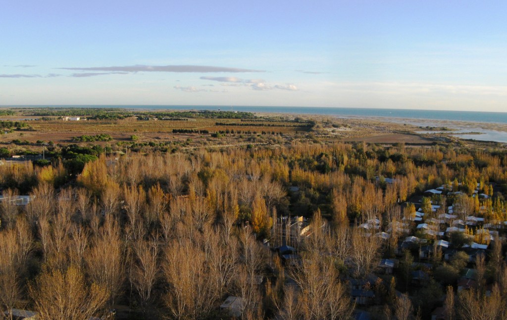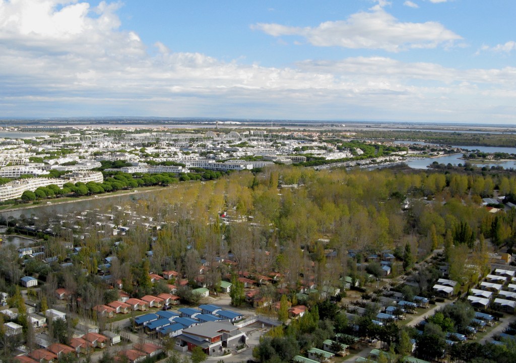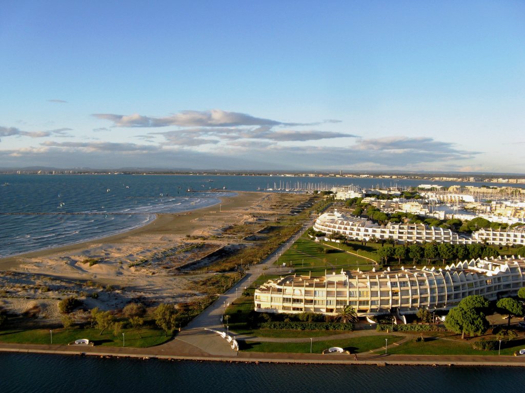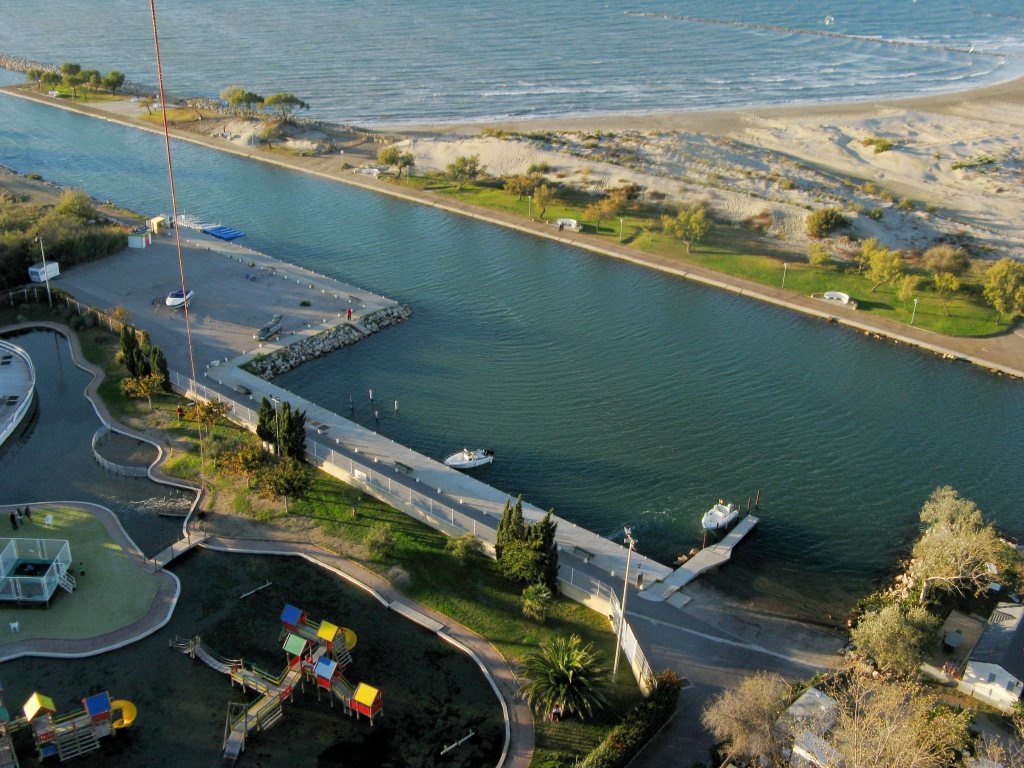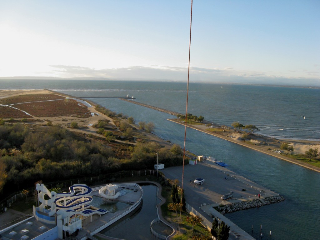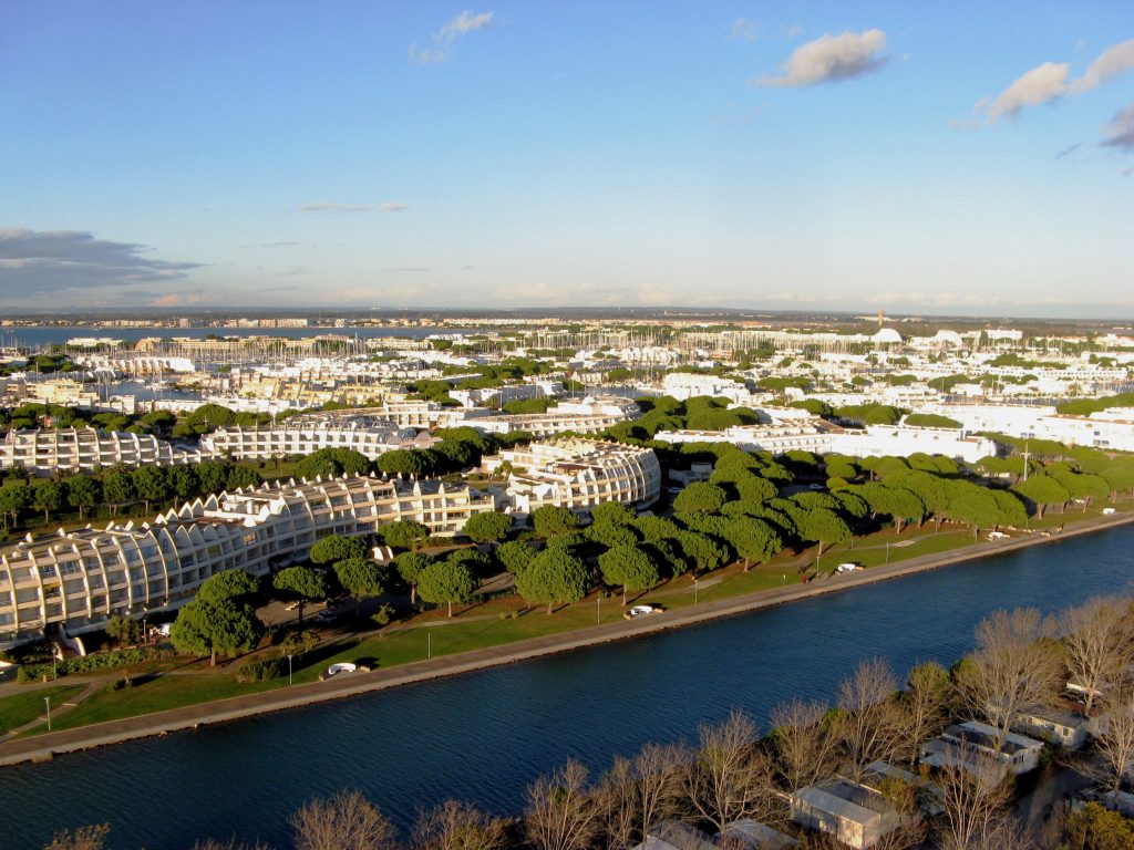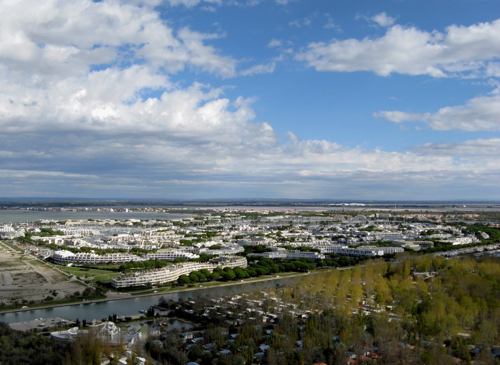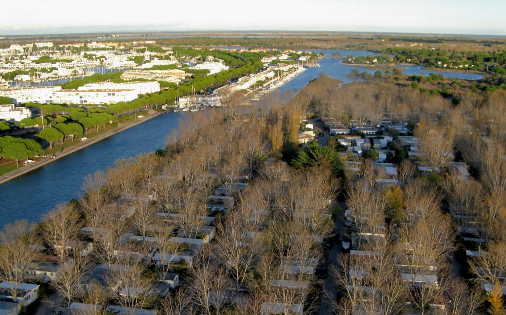 En tournant l’objectif vers l’Est, c’est un paysage sauvage et vierge qui porte la vue jusqu’aux Saintes Maries, 20km plus loin. A l’Ouest, juste de l’autre côté du canal portuaire, c’est l’incroyable Port Camargue et ses résidences extravagantes issues des délires architecturaux des années 60.
