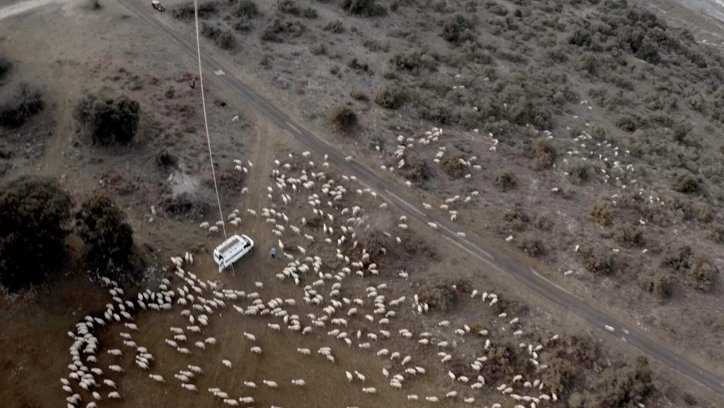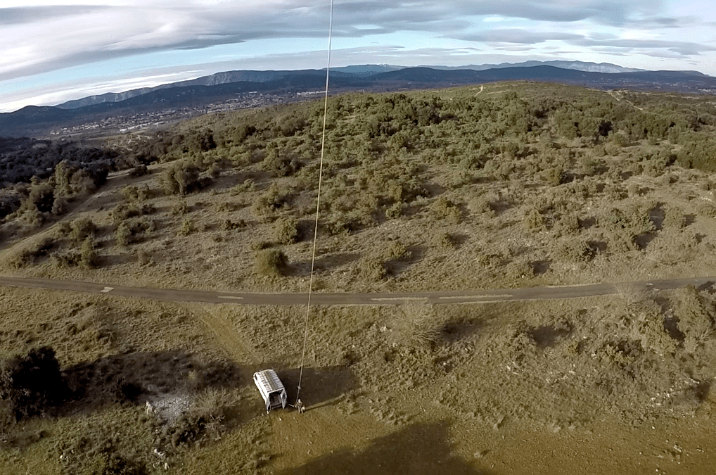 Comme son matricule l’indique, c’est mon cerf-volant pour situations extrêmes qui fut réquisitionné comme porteur. J’ai donc installé les points d’ancrages, poulies et mousquetons sur l’échelle arrière de l’utilitaire. Histoire de poursuivre mes tutos sur la photographie aérienne, j’ai aussi mis en batterie une caméra PNJ sur un trépieds. J’étais fin prêt à ma séance photos, mais c’était sans compter sur l’omniprésence envahissante des cloches et bêlements d’un troupeau de 300 moutons, arrivant droit sur moi.