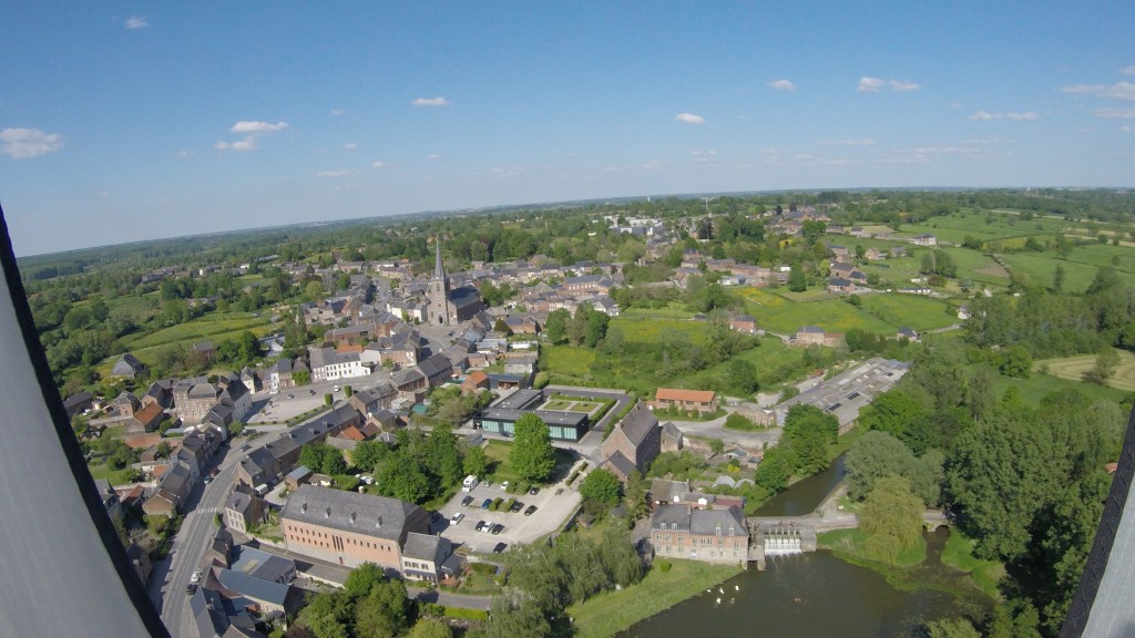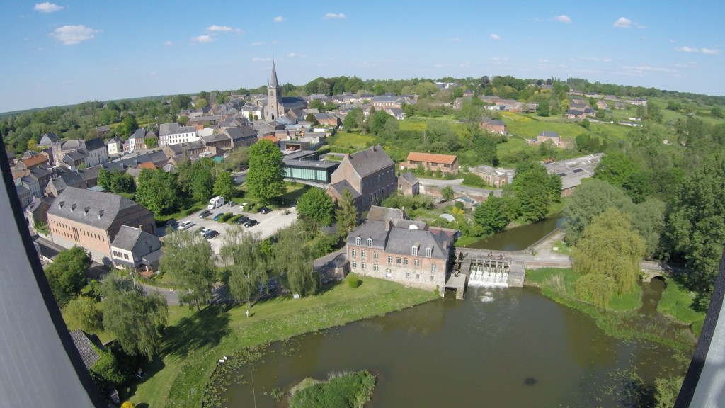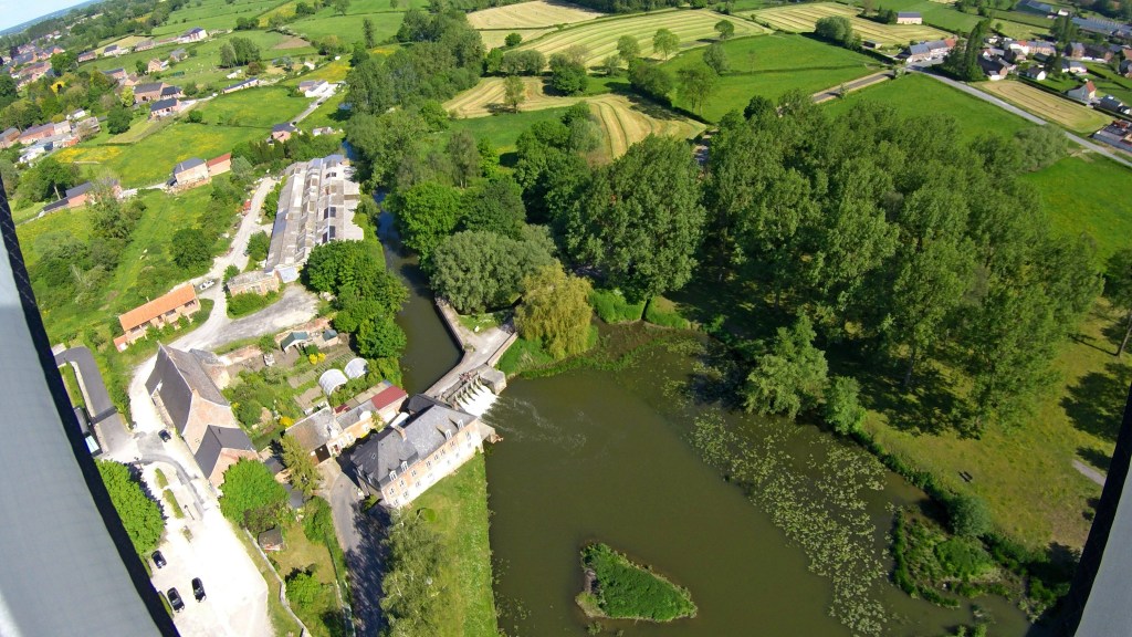 Nous avions choisi notre piste d’envol au cœur même du village, sur le terreplein bordant l’Helpe Mineure et au pied du moulin. L’endroit idéal pour des cerfs-volistes Kapistes en recherche d’adrénaline : des arbres centenaires, une barrière de maisons à étage, un plan d’eau pour décoller avec assez de recul et peut-être crasher les cerfs-volants et la caméra, vu le défi aérologique de l’endroit.