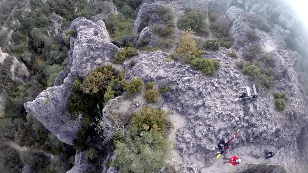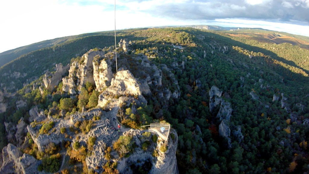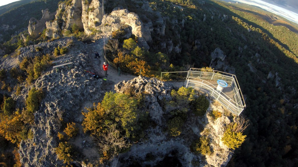Envol réussi, évidemment, avec une telle équipe de choc. Très vite la caméra et sa nacelle se sont élevés et stabilisés, shootant à 360° un décor de cinéma où nous nous attentions à voir surgir des dragons dans une lumière hivernale flamboyante au coucher du soleil. Ni dragons, ni princes ou princesses, ici, mais l’arrivée discrète d’un témoin (Eric), qui s’était silencieusement installé dans notre dos sur un banc improbable, installé au sommet de cette montagne.