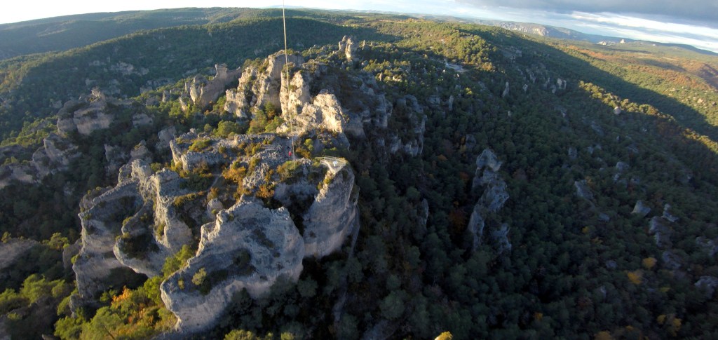 À 100 mètres au-dessus du promontoire de la ballade des « remparts », nous avions réussi à accrocher un cerf-volant Delta ultra léger. Nous ne nous attendions pas à trouver ici, mon petit fils et moi, de si bonnes conditions aérologiques; l’endroit est hérissé de rochers et entouré de falaises et de montagnes.