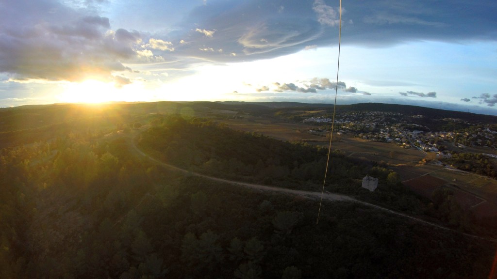 Mes prévisions se sont finalement révélées exactes, avec une lumière des « heures dorées » et un coucher de soleil de superproduction hollywoodienne. De là-haut, j’ai pu aussi prendre toute la mesure du chantier routier qui devrait permettre, dans quatre ans, un contournement fluidifié du Nord de Montpellier. Aujourd’hui, c’est une grande balafre dans la forêt et un tracé que l’on peut facilement deviner et qui va enjamber plusieurs routes, une rivière pour enfin gravir un col jusqu’à la jonction avec l’autoroute A750. Gigantesque chantier, dont il ne m’appartient pas de juger les tenants et aboutissants, mais uniquement de témoigner d’un changement industriel, jugé nécessaire, et d’une transformation d’un paysage, dont certains affirment qu’il sera remodelé, paysagé et compensé par de nouvelles et nombreuses plantations.