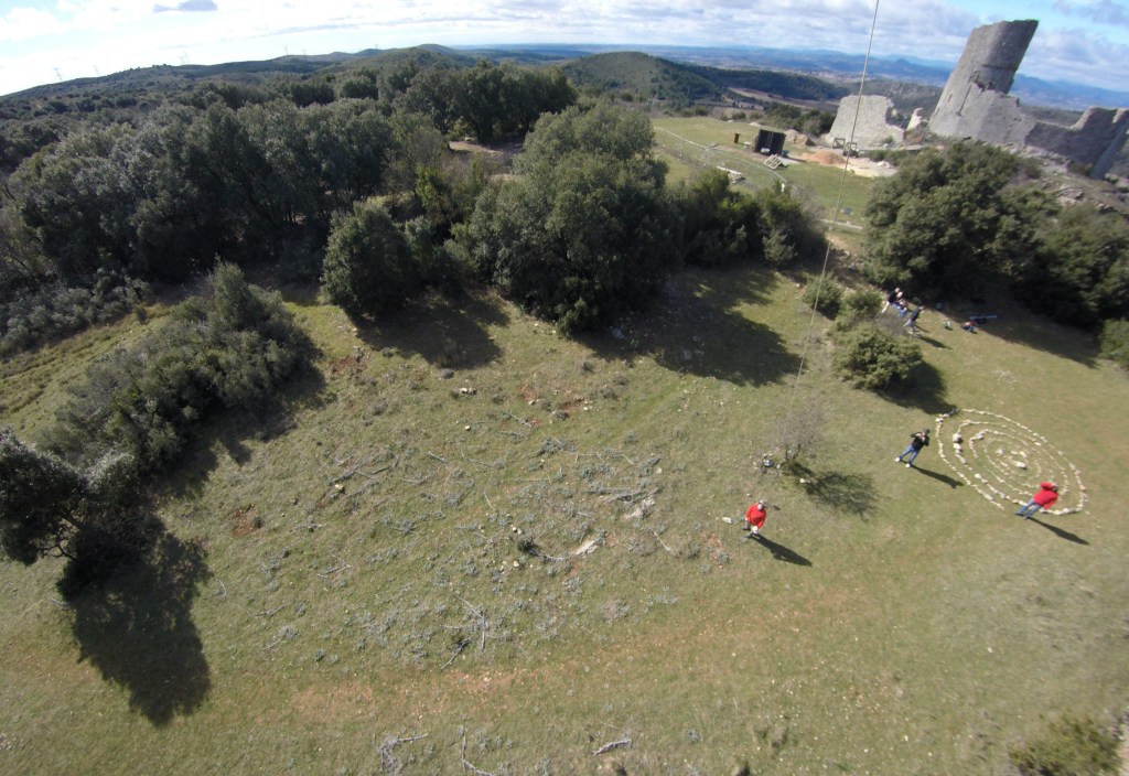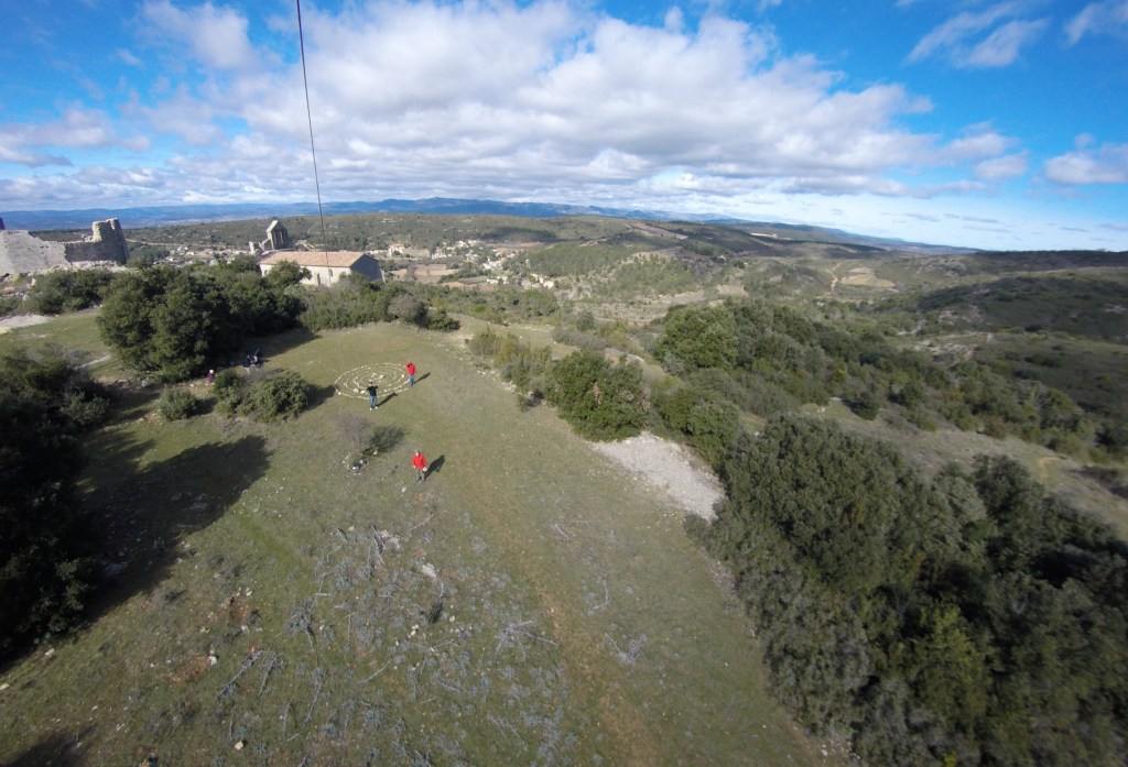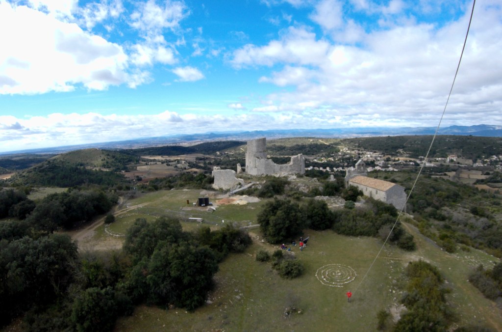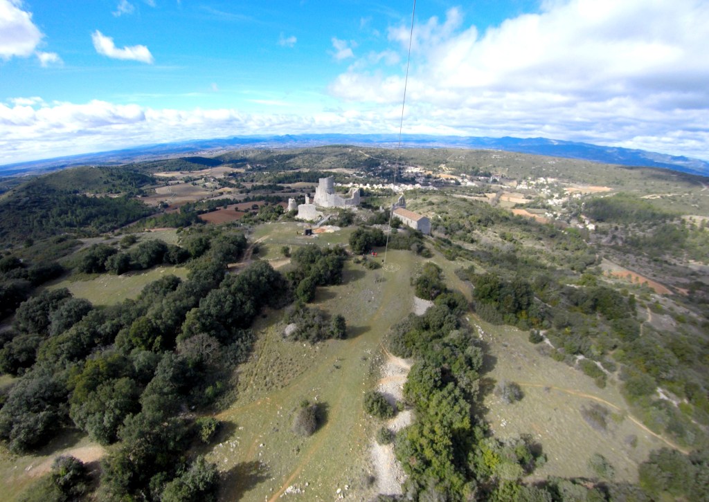 Pas de grandes difficultés pour accéder au château, même si la pente est un peu raide sur la fin. La ruine en chantier a été clôturée pour des raisons de sécurité, mais c’était sans compter sans nos machines volantes pour aller découvrir de là-haut un morceau d’histoire. La Tramontane musclée interdisait tout survol avec un drone, mais un cerf-volant se joue bien de ces conditions extrêmes. Au sommet du relief les vents sont toujours turbulents, aujourd’hui ils sont, ici, caractériels. Le minuscule « Flowform » de 1 m², choisi pour l’occasion, fit un envol acrobatique avec des hoquets qui l’ont carrément mis sur le dos à trois reprises. Finalement, à 60 m au-dessus de la colline, il a trouvé le courant porteur. Malgré sa petite surface, nous avions attaché la ligne à un mousqueton et une drisse solidement ancrée à un arbuste. Sage précaution pour ne pas terminer la journée aux urgences, car les coups de boutoir de la Tramontane peuvent être périlleux.