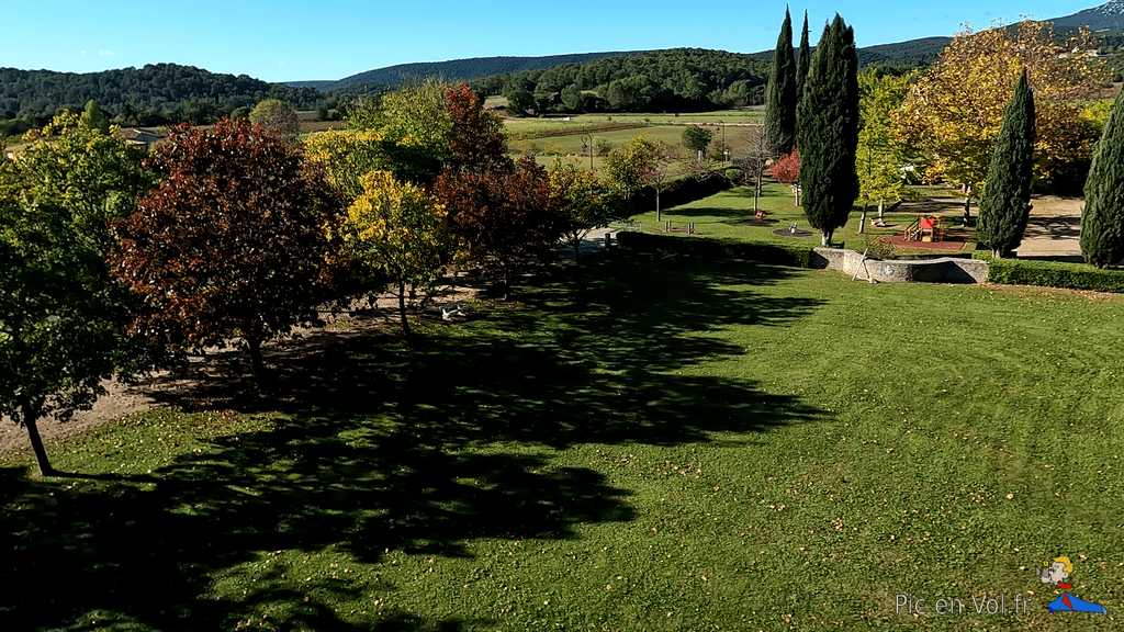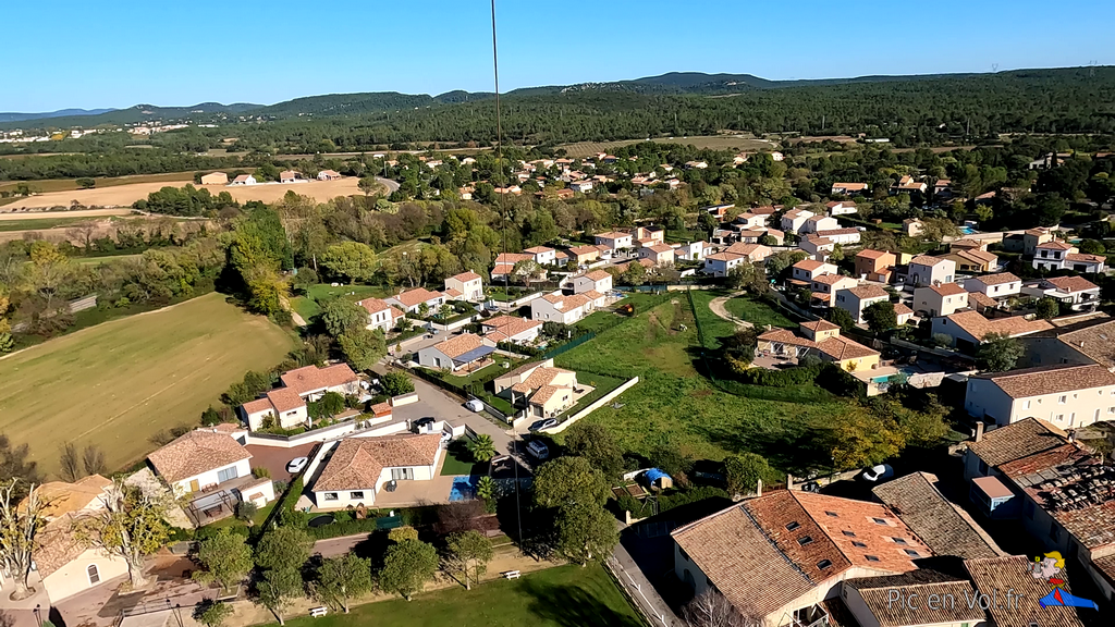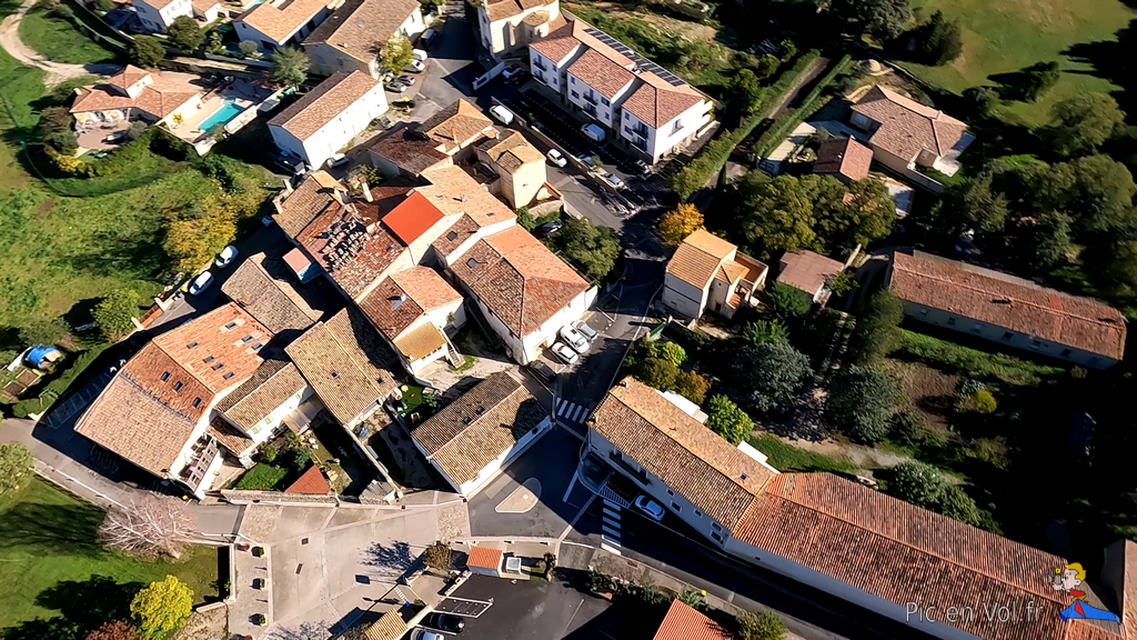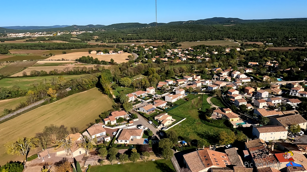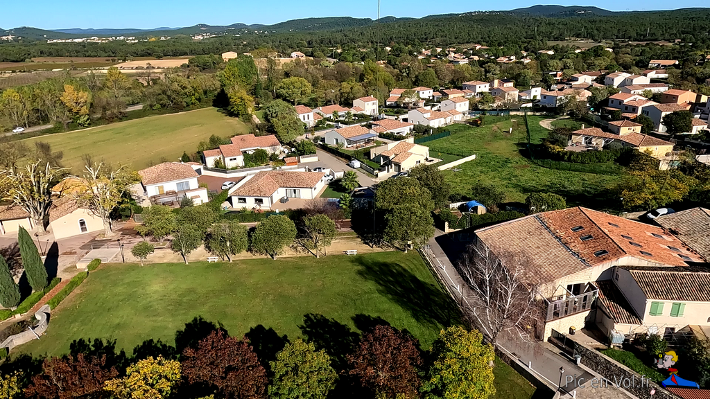 Nous n’avons pas eu beaucoup à chercher pour trouver une piste d’envol pour nos cerfs-volants photographiques. À l’entrée du village, un square accueillant, ouvert sur les champs, offrait un espace dégagé et de quoi dérouler les 50 m de ligne nécessaires pour passer la cime des arbres et le faitage des toits. Il nous fut facile d’accrocher la brise de nord-est qui se faisait attendre en ce chaud début d’après midi. Après avoir rassuré un riverain du parc, occupé à jardiner, sur l’objet du survol de sa maison et du village, le vent s’est enfin établi et, avec l’aide d’un passant, notre grand Delta de 5 m s’est élevé dans un ciel sans nuages. Lorsque l’impression est bonne au raz du sol, avec la prise de hauteur, la nature et le patrimoine sont sublimés, ce fut le cas au Triadou. Le panorama dévoilé, grâce à nos cerfs-volants, aura révélé tous les aménagements en cours dans la commune, mais aussi le fragile équilibre nécessaire pour tempérer la pression immobilière et son urbanisme incontournable et préserver les espaces libres, paysagés ou sauvages que la municipalité, quelques propriétaires privés et les viticulteurs ont à cœur de développer.