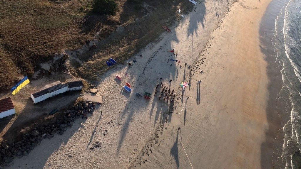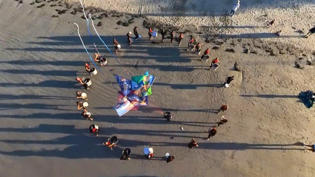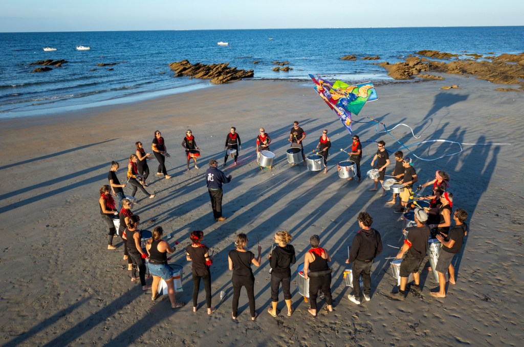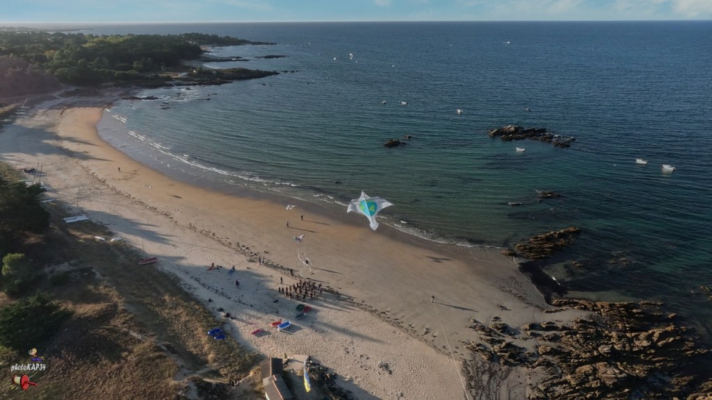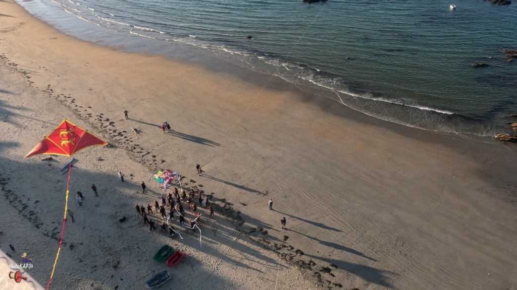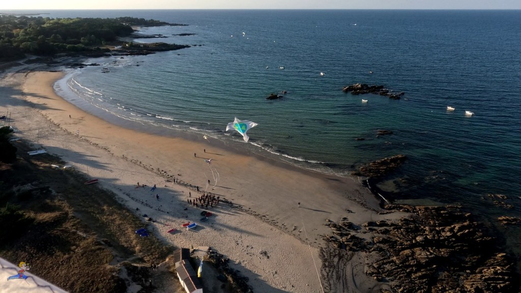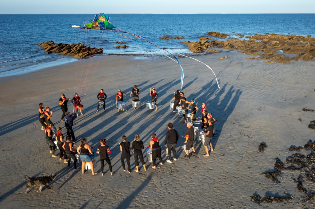 La seconde séance, au coucher du soleil, fut un de ces instants qui laissent en vous une empreinte mémorielle indélébile. Imaginez une lumière dorée de fin de journée, dans un décor de roches et d’océan capable de rivaliser avec les plus sublimes lagons. Imaginez des cerfs-volants transportant leurs caméras et leurs appareils photos au dessus du paysage et d’un groupe de 25 percussionnistes animant la plage, dans une ambiance de samba endiablée. Imaginez cet ilien , Thierry, en osmose avec son cerf-volant « révolution » piloté en une dance gracieuse, céleste et terrestre, à la fois. Imaginez, surplombant cette scène irréelle, une immense colombe de la paix planant sur un instant de paix, justement. Imaginez enfin, Michel, l’artiste cerf-voliste évoluant au milieu du groupe de musiciens, dans une complicité rythmique avec le vent et son œuvre devenue dansante…. Sublime !