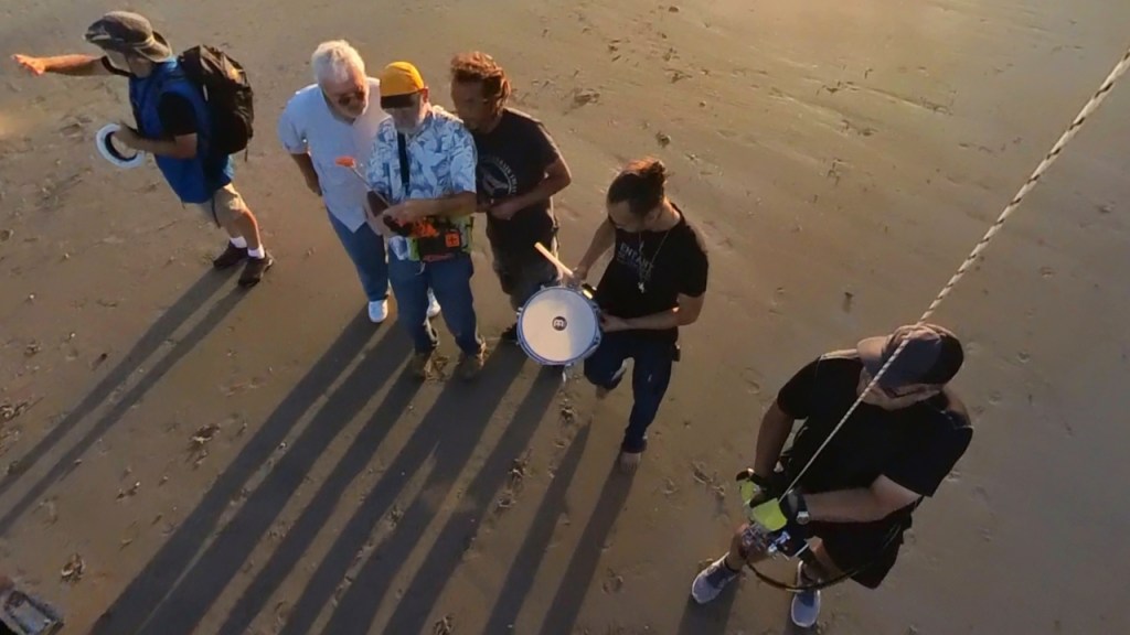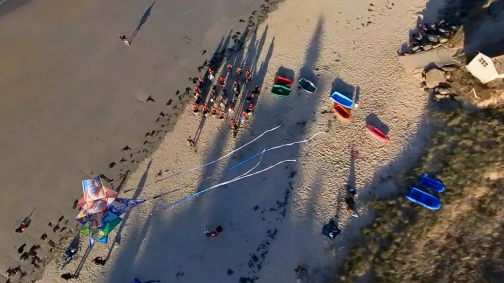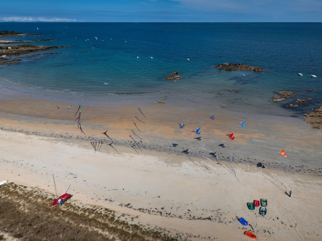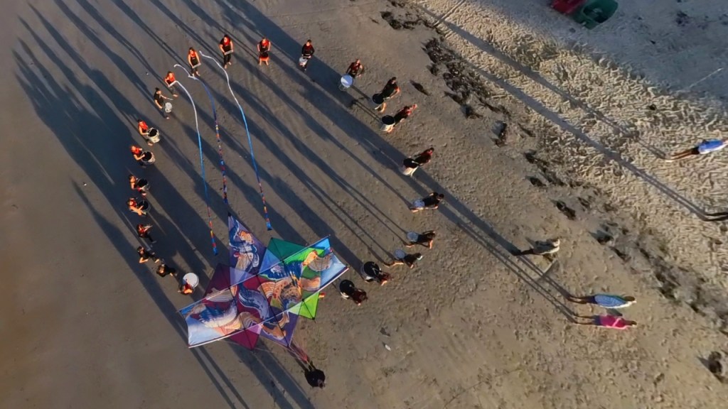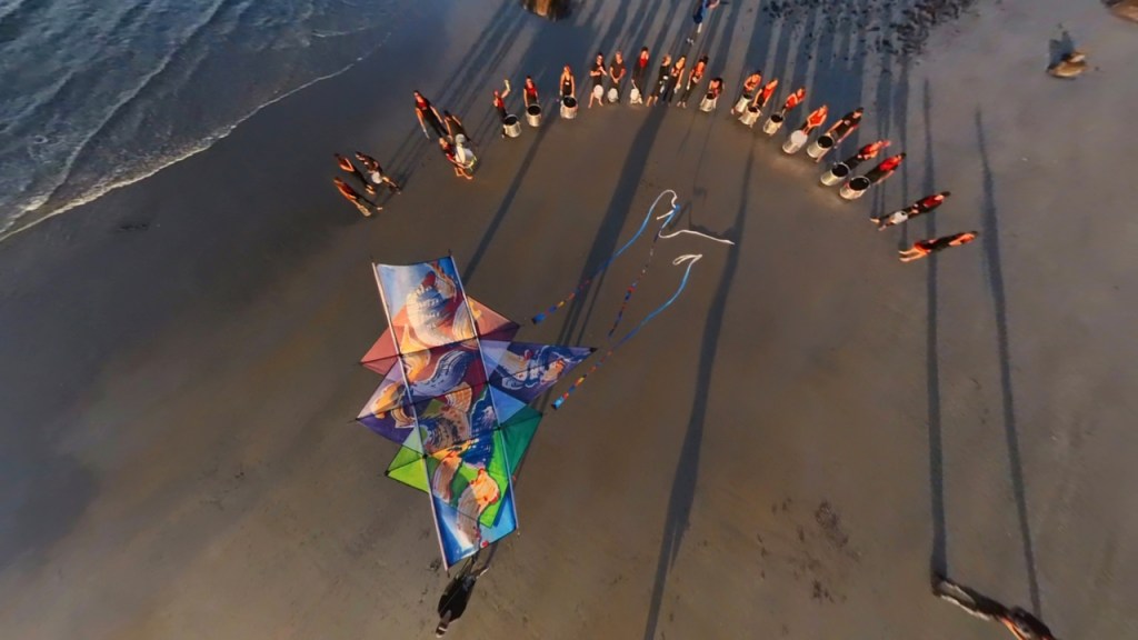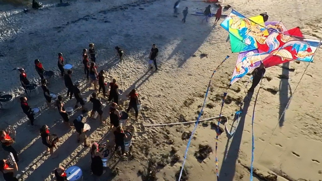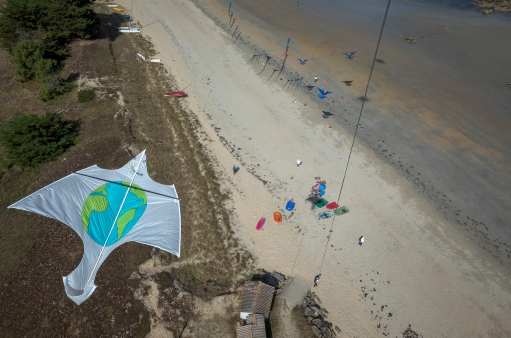 La seconde séance, au coucher du soleil, fut un de ces instants qui laissent en vous une empreinte mémorielle indélébile. Imaginez une lumière dorée de fin de journée, dans un décor de roches et d’océan capable de rivaliser avec les plus sublimes lagons. Imaginez des cerfs-volants transportant leurs caméras et leurs appareils photos au dessus du paysage et d’un groupe de 25 percussionnistes animant la plage, dans une ambiance de samba endiablée. Imaginez cet ilien , Thierry, en osmose avec son cerf-volant « révolution » piloté en une dance gracieuse, céleste et terrestre, à la fois. Imaginez, surplombant cette scène irréelle, une immense colombe de la paix planant sur un instant de paix, justement. Imaginez enfin, Michel, l’artiste cerf-voliste évoluant au milieu du groupe de musiciens, dans une complicité rythmique avec le vent et son œuvre devenue dansante…. Sublime !