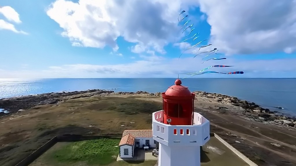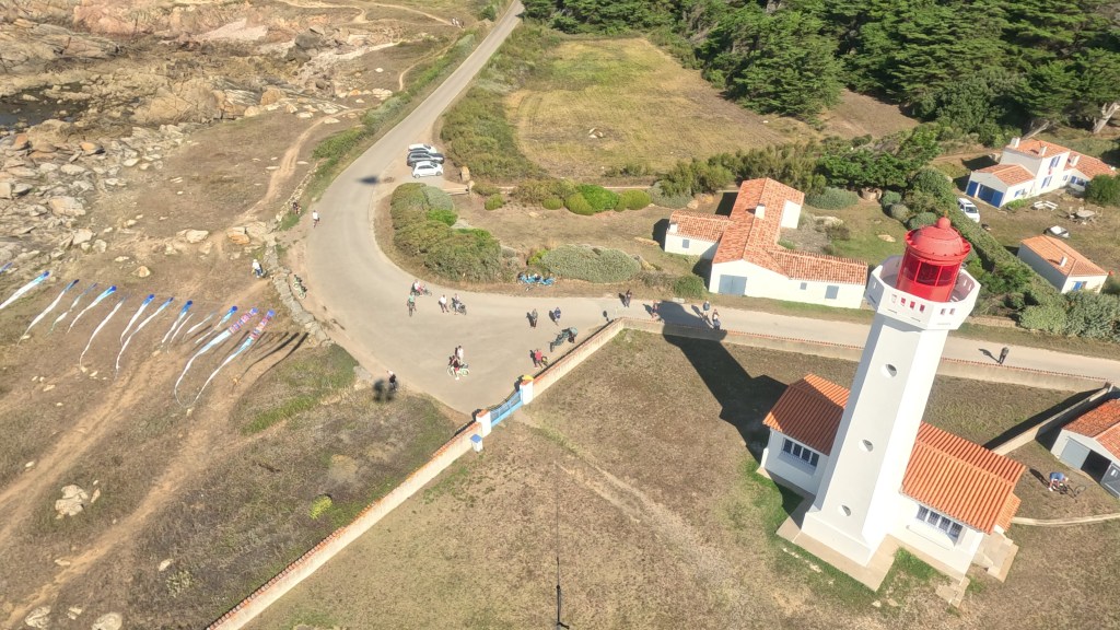 Nous étions tous en vol, occupant l’espace aérien et terrestre, plantés dans le ciel à des altitudes différentes et cherchant à capturer, sur nos cartes mémoires, les œuvres volantes survolant la lanterne rouge du phare, une prouesse pour ne pas croiser les fils et mettre à mal nos nacelles photographiques. Les badauds et les cyclistes, fort nombreux, furent interpellés par le spectacle insolite des papys grisonnants ou blanchissants cherchant à transformer le phare en arbre de Noël.