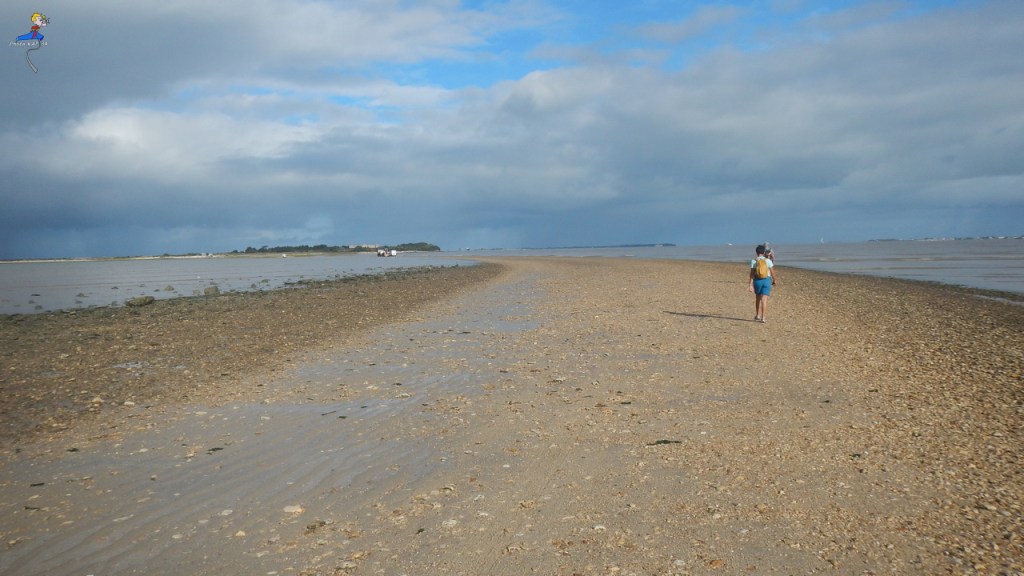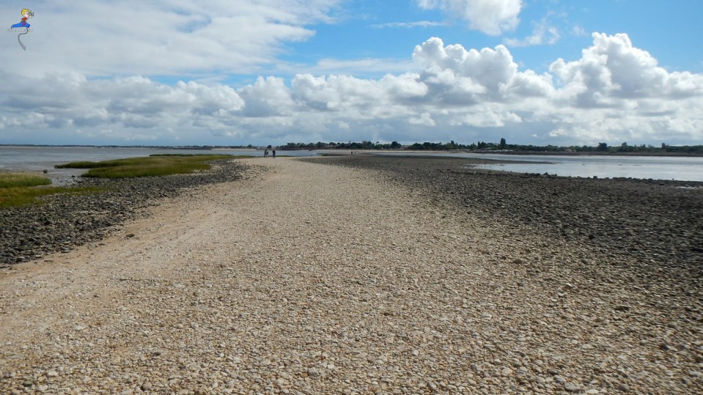 A 8h une longue file hétéroclite attendait le découvrement de la passe aux bœufs: piétons, vélos, motos, camions de livraison, camping-cars et quelques rares voitures…Nous avons abordé l’île, à vélo, par la grève caillouteuse découverte. Le passage du gois à peine visible, la colonne s’était mise en mouvement avec précaution, car ici point de bitume ni de béton, seulement des galets, des affleurements rocheux et du sable.