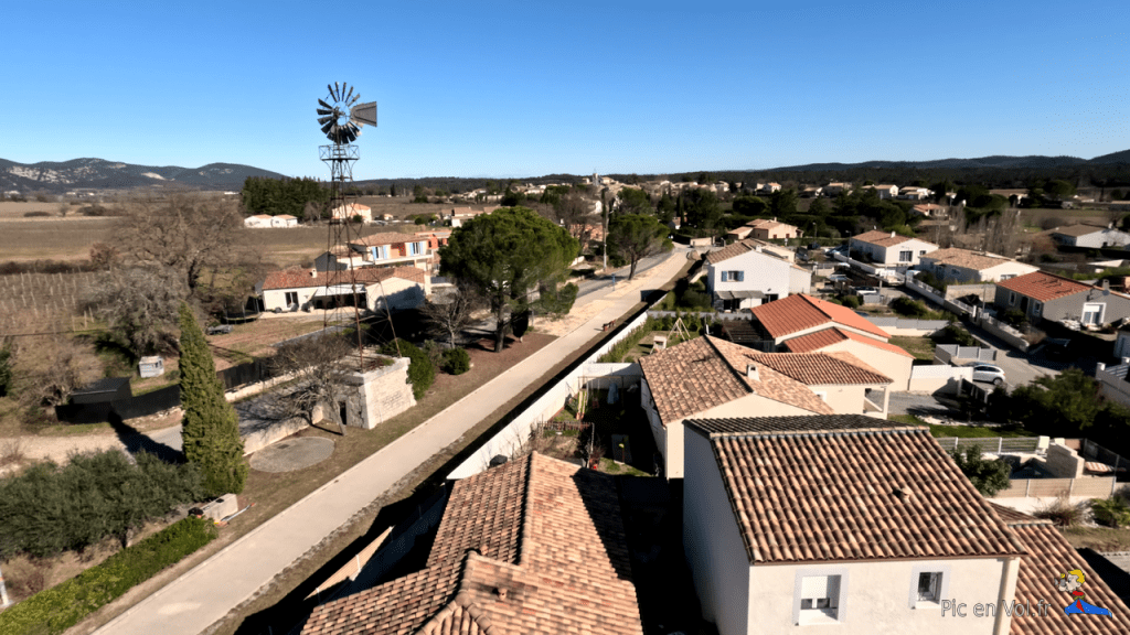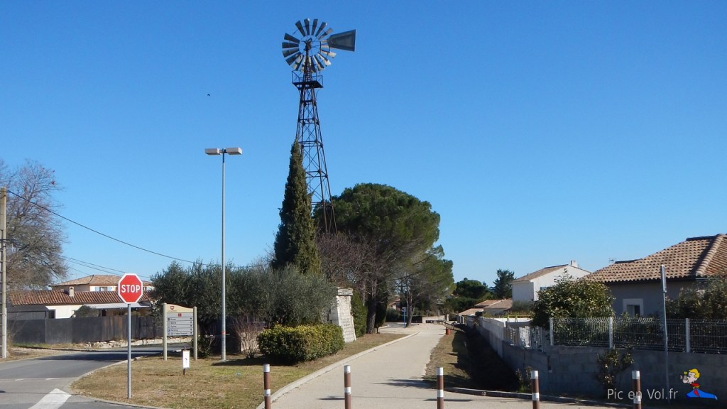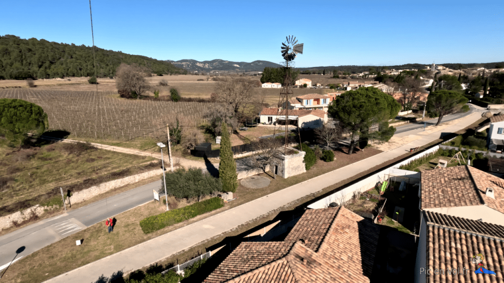 Nous avons dû revenir, car Vacquières est aussi fière de son moulin qui pompait l’eau, avec du vent, depuis les couches profondes de son sous-sol. Une autre visite, à la mi-journée cette fois, qui m’aura donné le sentiment nostalgique de retrouver le village de mon enfance et une belle occasion d’un survol d’une antique éolienne, figure de proue de cet endroit si paisible qu’on en oublierait le temps qui passe.