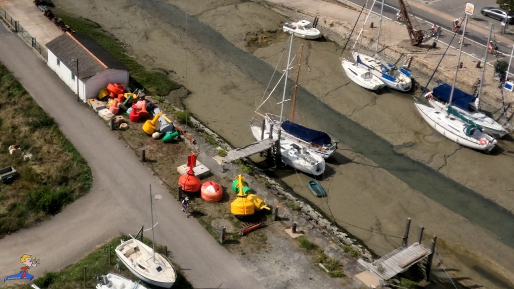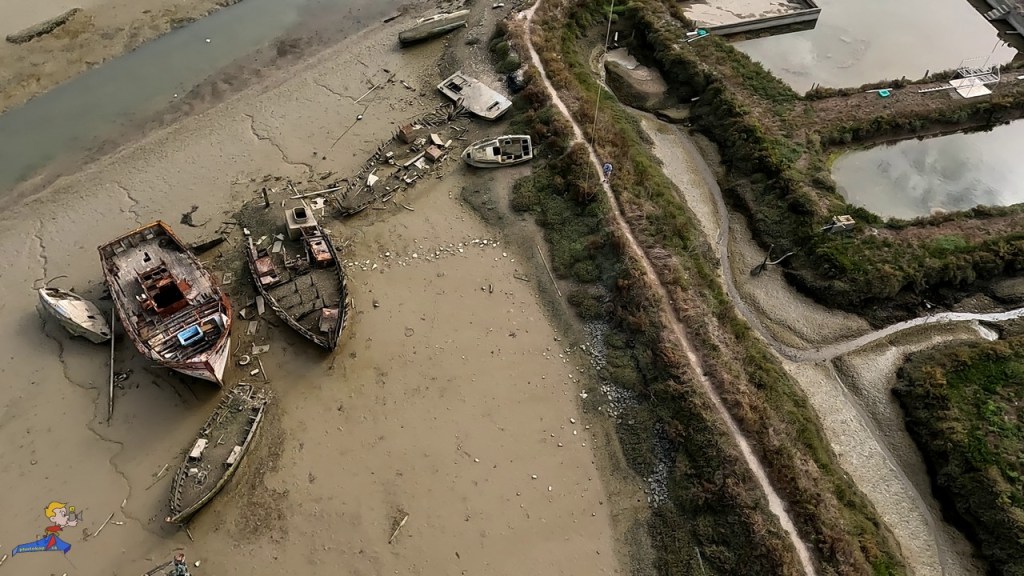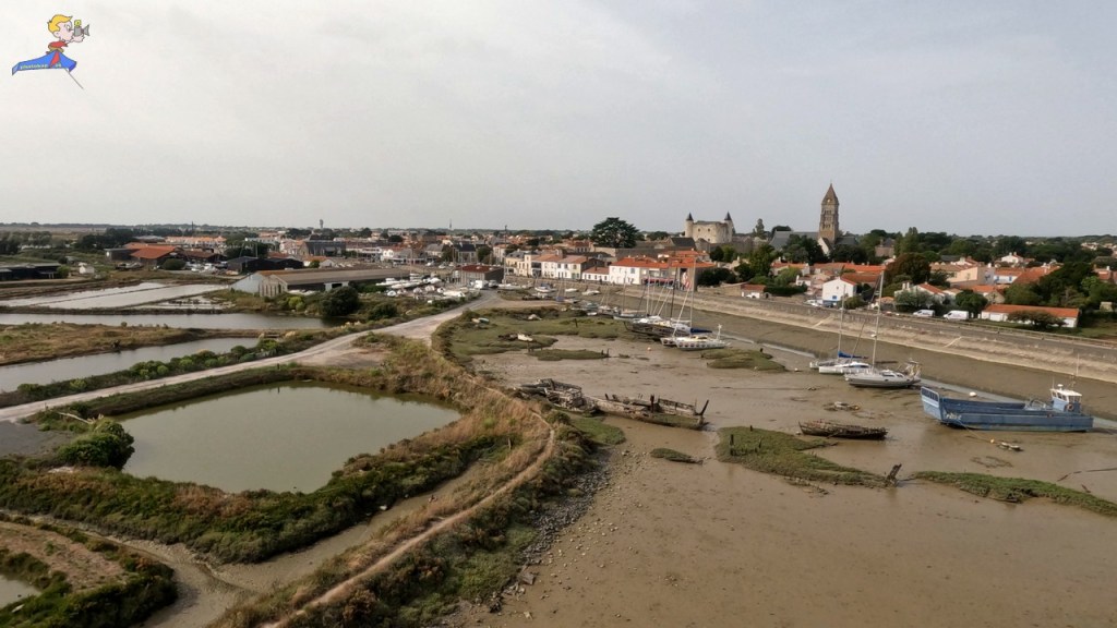 Le choix d’une photo à commenter était cornélien, tant les sujets photographiés furent nombreux et exceptionnels. C’est donc la ville qui a donné son nom à l’île « Noirmouliers ». Il nous faudra pas moins de trois visites, et donc trois survols, pour capturer les images emblématique du lieu. Pour réaliser cette photo du port, nous avons choisi un point d’envol sur le quai rive droite, face au château. depuis ce point d’envol, nous avons pu embrasser, d’un coup, la ville, ses monuments le port, les épaves échouées du cimetière à bateaux, les salines et les parcs ostréicoles, et, enfin l’immense digue de l’étrier du moulin.