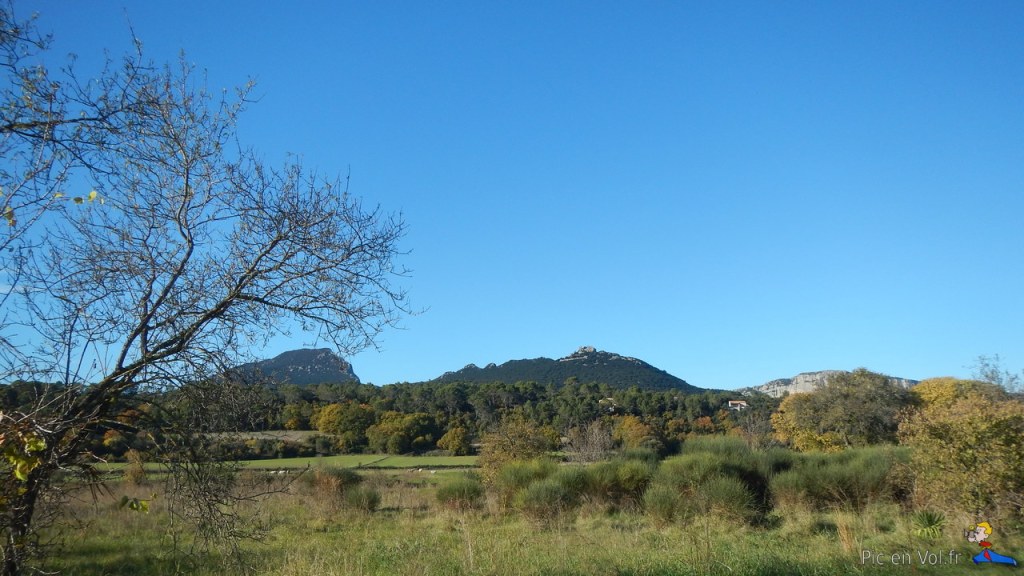 Nous ne pensions découvrir, ici, qu’un paysage emblématique de pics, de châteaux ruinés et de vignobles désormais connus et appréciés par la gastronomie française… Cela aurait été le cas, si nous n’avions pas pris un peu de hauteur. Trouver des sites d’envols ne fut pas une mince affaire, la ville est étendue, à la fois résidentielle, active, agricole et historique, avec des routes traversantes, mais aussi des chemins creux et étroits entourés de reliefs et d’obstacles aux vents dominants. C’est finalement sur les digues des barrages des retenues collinaires de Jeantou et de Cécélés, du parking de la piscine municipale, des chemins proches du couvent des Dominicaines des tourelles et enfin du terrain vague et inondé à côté du siège de la communauté de communes du Grand Pic St Loup, que nous aurons pu réunir les bonnes conditions pour le décollage de nos cerfs-volants… Au final, c’est plus de 10 km parcourus à pied et près de 3000m de lignes à cerf-volant qu’il nous aura fallu dérouler et enrouler, lors des 10 envols nécessaires à ce reportage.