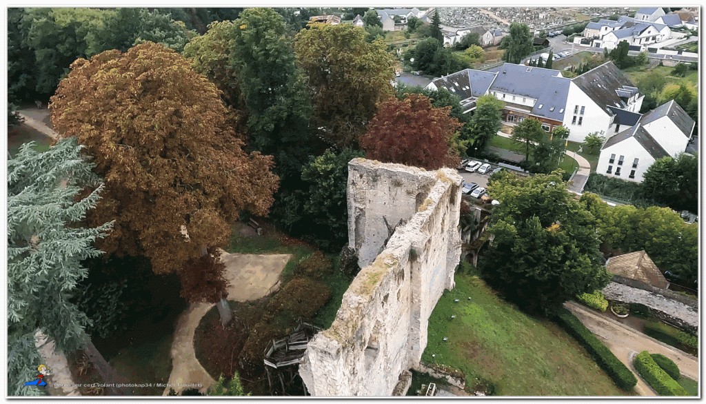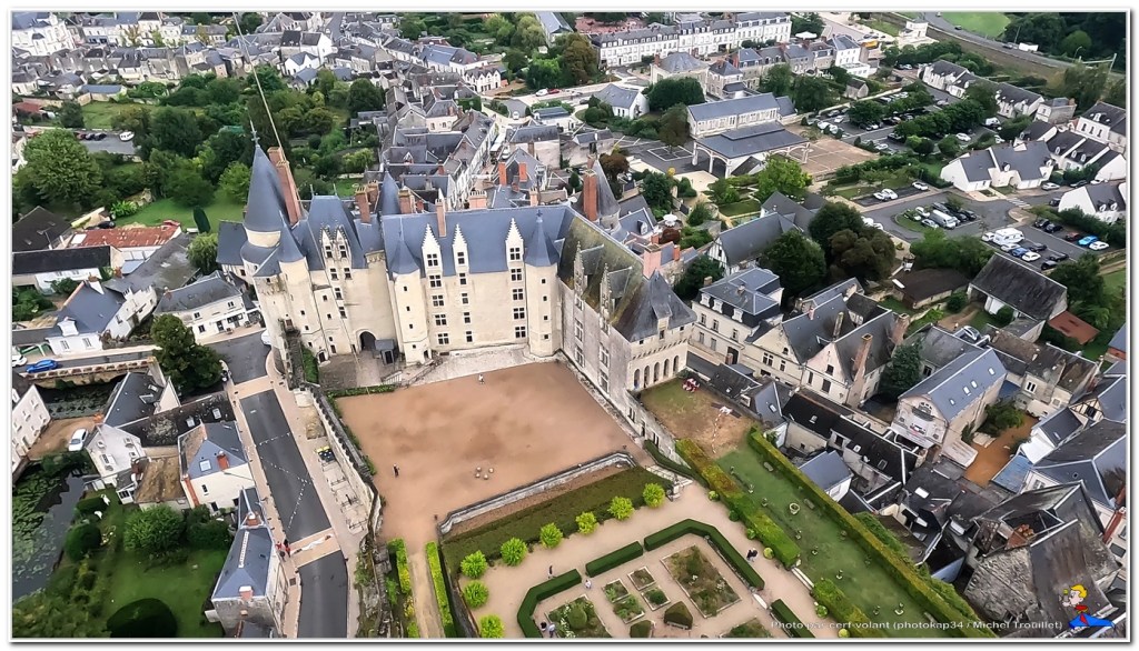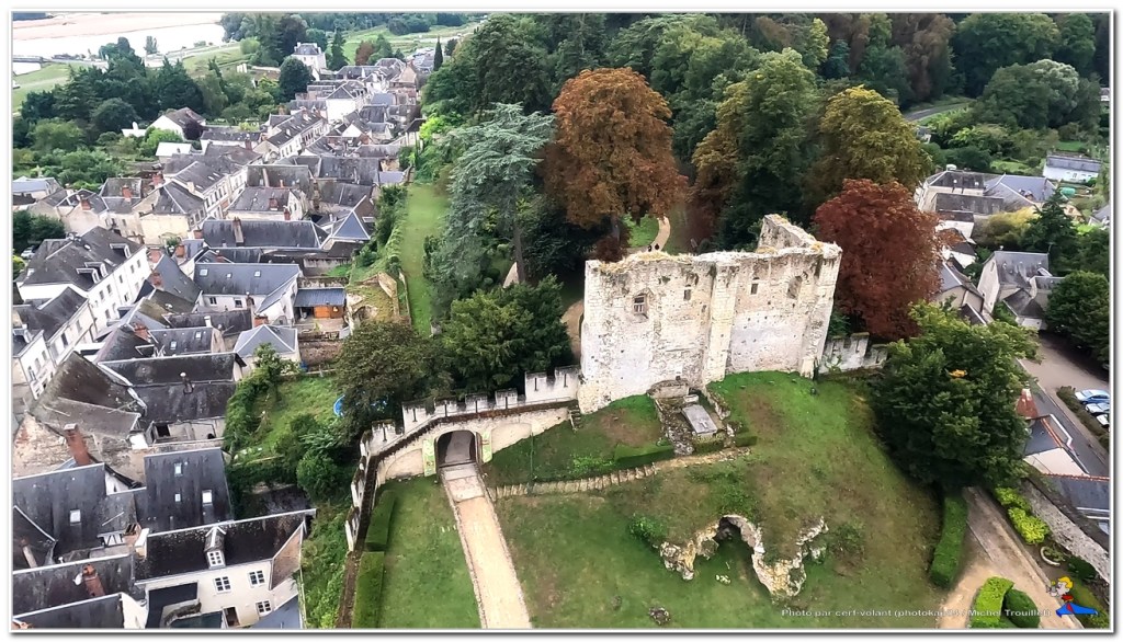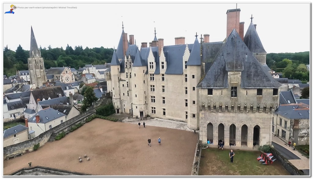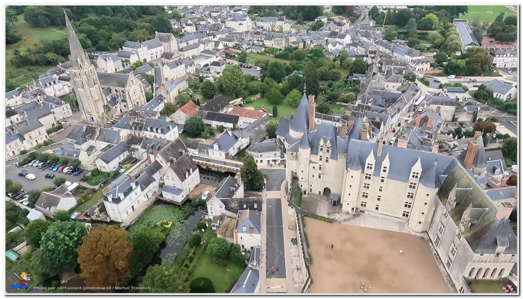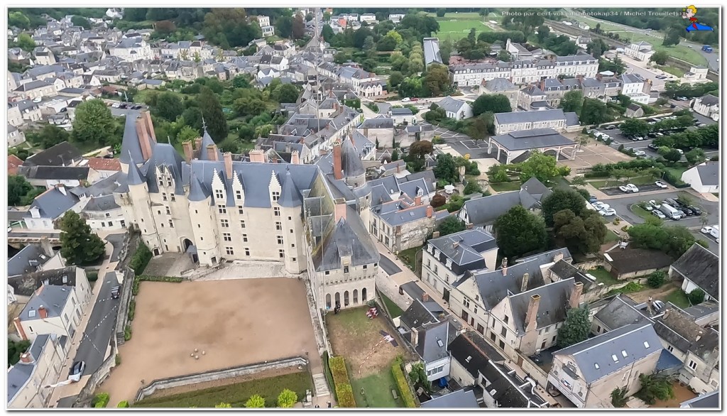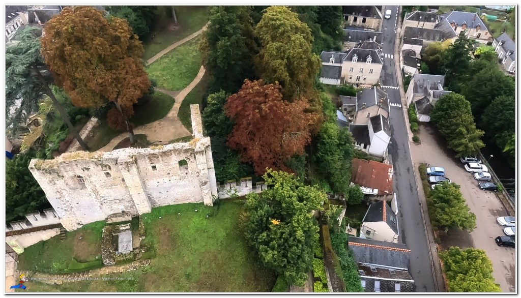 Jusqu’à 50m, l’envol fut chaotique, (freestyle comme on dit aujourd’hui), mais, à l’aplomb de la tour de la cloche, le vent d’ouest est devenu le meilleur ami de nos cerfs-volants, pour leur offrir un vol aussi stable qu’un clou planté dans le ciel. C’est presque dans l’indifférence des touristes visiteurs, que nos cerfs-volants ont survolé Langeais, pourtant le fait était éminemment historique, car sans précédent depuis 1000 ans pour un survol cerf-voliste au-dessus du donjon de FoulquesNerra