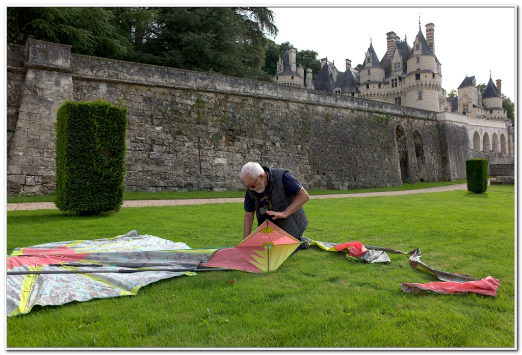 Sans trop d’illusions, nous avons commencé à monter quelques cerfs-volants de création, dont un impressionnant dragon, afin de réaliser d’hypothétiques envols sur fond de château de la belle au bois dormant.