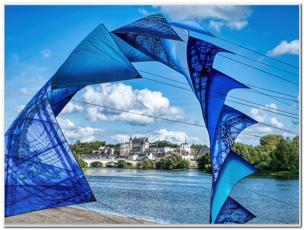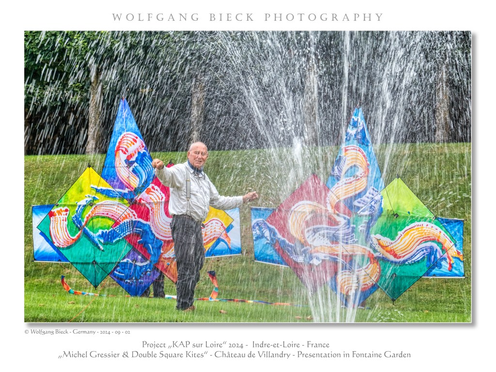 Michel Gressier, pour l’occasion, avait réuni autour de lui un aréopage de 12 photographes aériens par cerf-volant, pour le moins hétéroclite : un photographe du vent allemand, un polynésien, un français « immigré » en Italie et quelques passionnés experts « Kapistes » des quatre coins de l’hexagone. Si cet article vient clôturer un projet préparé de longue date (on n’improvise pas le survol de chefs-d’œuvre historiques). Il n’est pas possible de refermer cette page sans y associer le portrait d’un artiste qui a marqué cinq décennies de créations cerf-volistiques et de contributions créatives en Touraine, par ses initiatives artistiques, par ses scénographies, ses pavoisements et ses expositions dans les hauts lieux historiques et patrimoniaux de la Loire. Michel nous a reçus dans ses ateliers, chez lui et sur un bateau de l’association des bateliers de la Loire, dont il fait partie,